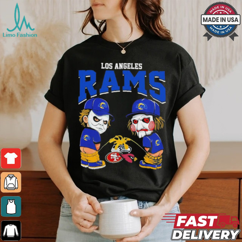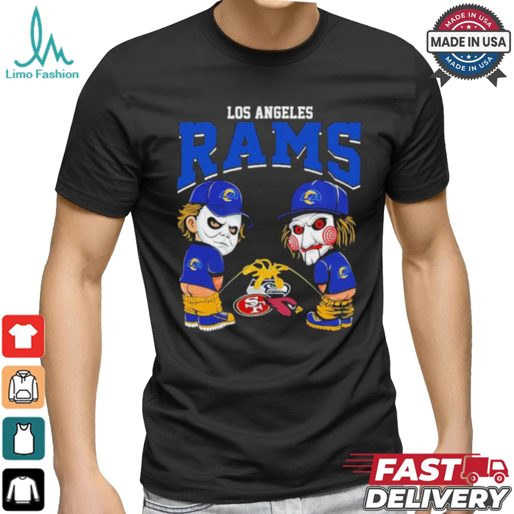 ()Michael Myers And Billy The Puppet X Los Angeles Rams Pee On NFL Teams Halloween Shirt, Hoodie, Sweater, Vneck, Unisex and T-shirt