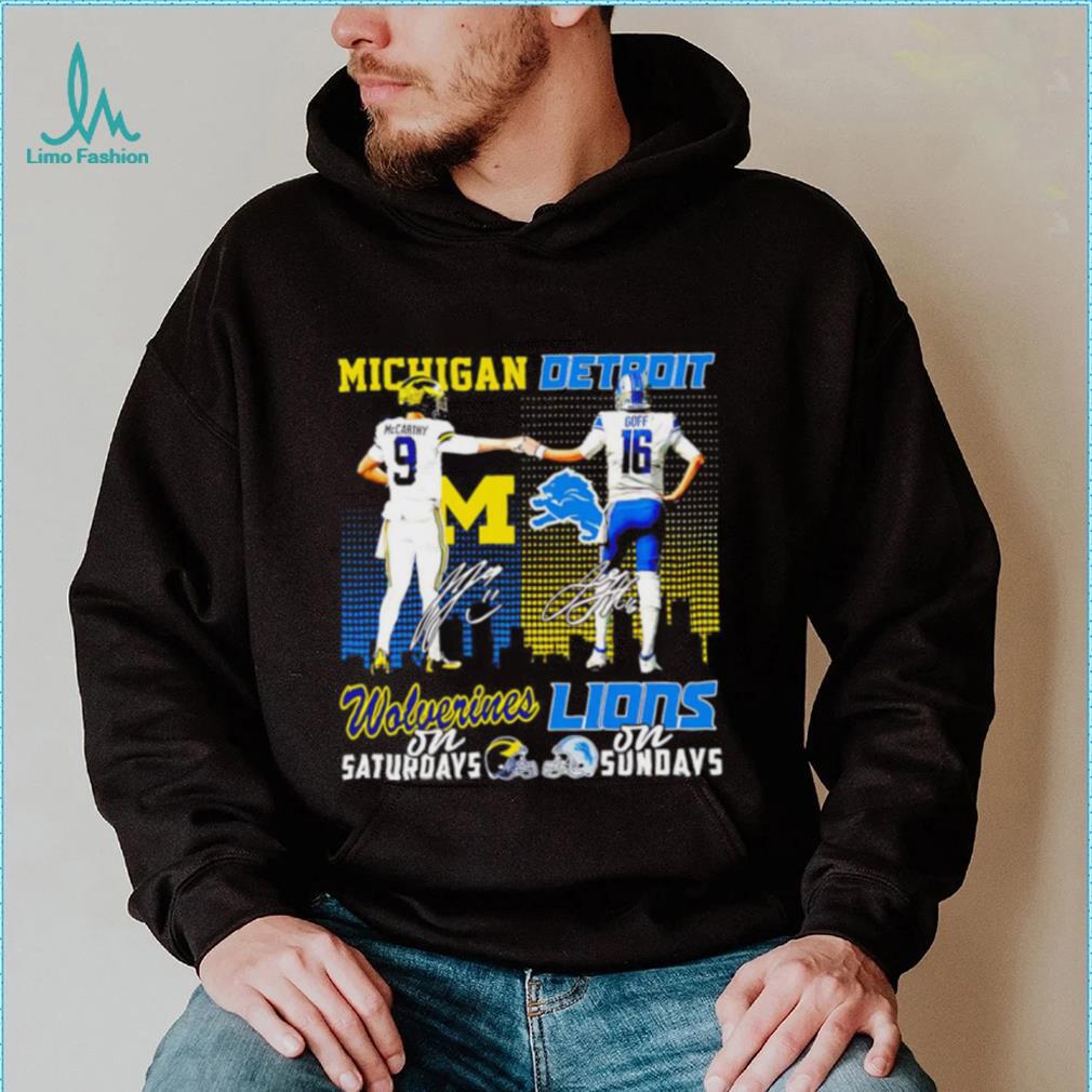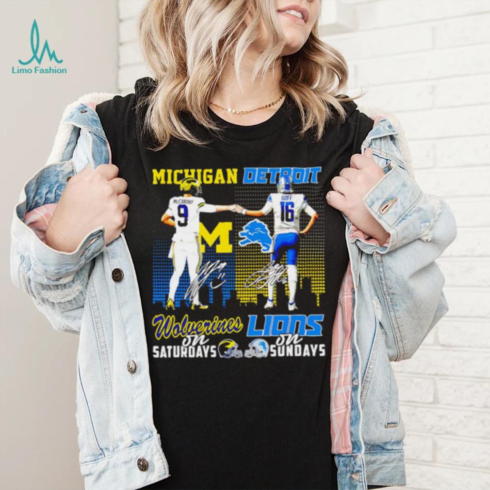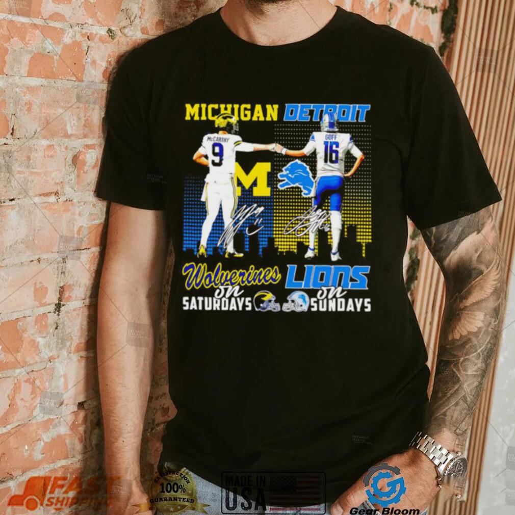 ()Michigan Wolverines on saturdays Detroit Lions on sundays J.J. McCarthy and Jared Goff signatures skyline shirt