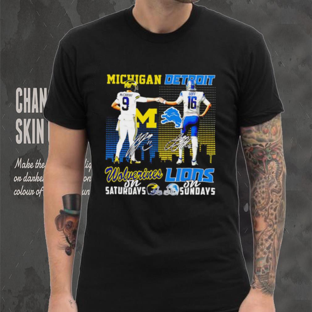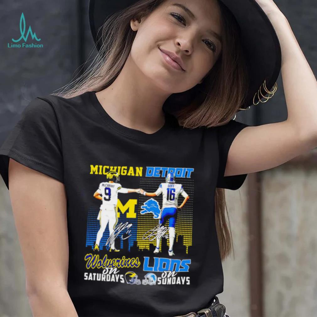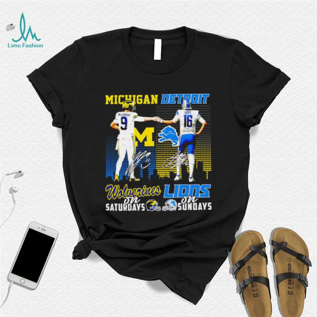 ()Michigan Wolverines on saturdays Detroit Lions on sundays J.J. McCarthy and Jared Goff signatures skyline shirt