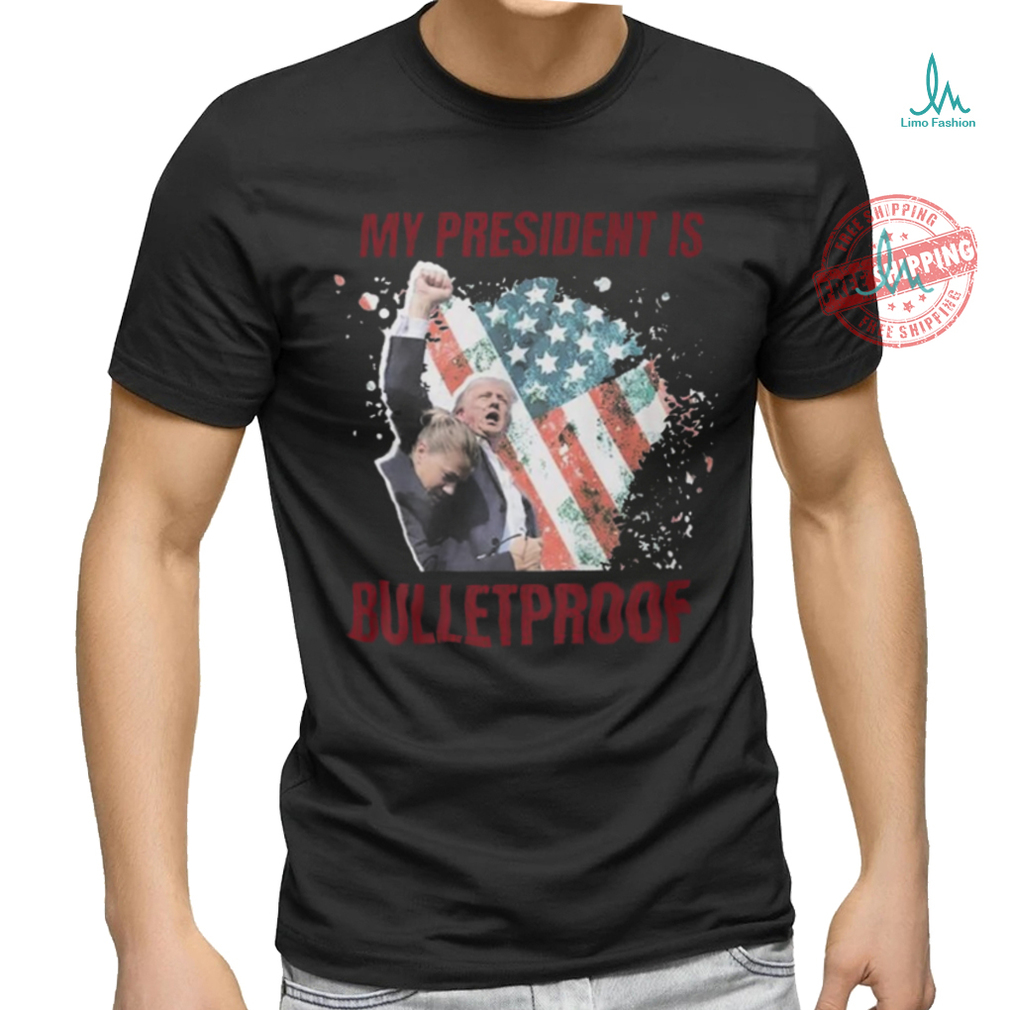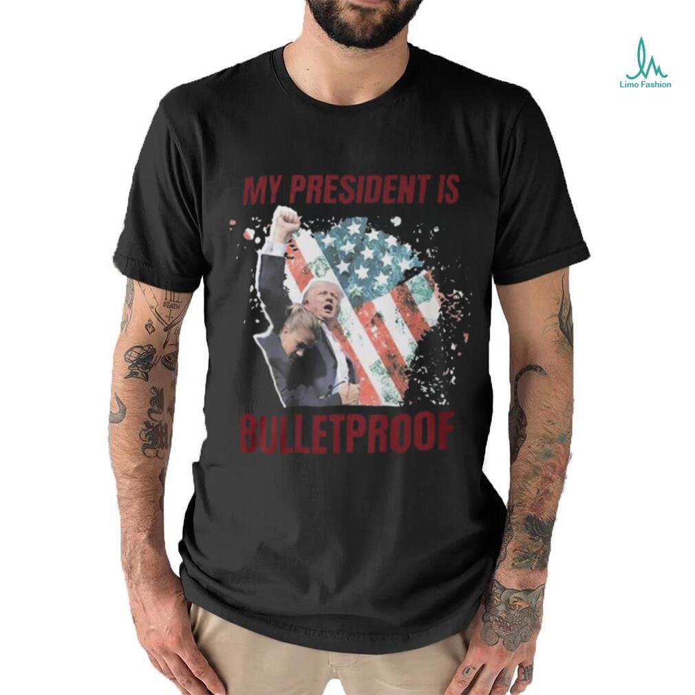 ()My President is bulletproof t shirts. Categories of this T-shirt is teejeep, My President is bulletproof t shirts from Dadyshirt ✓ Unique designs ✓ Large assortment ✓ Comfortable ✓ High-quality ✓ Easy to care for ✓ Available in a range of colours and styles for men, women ✓ Shop now ✓