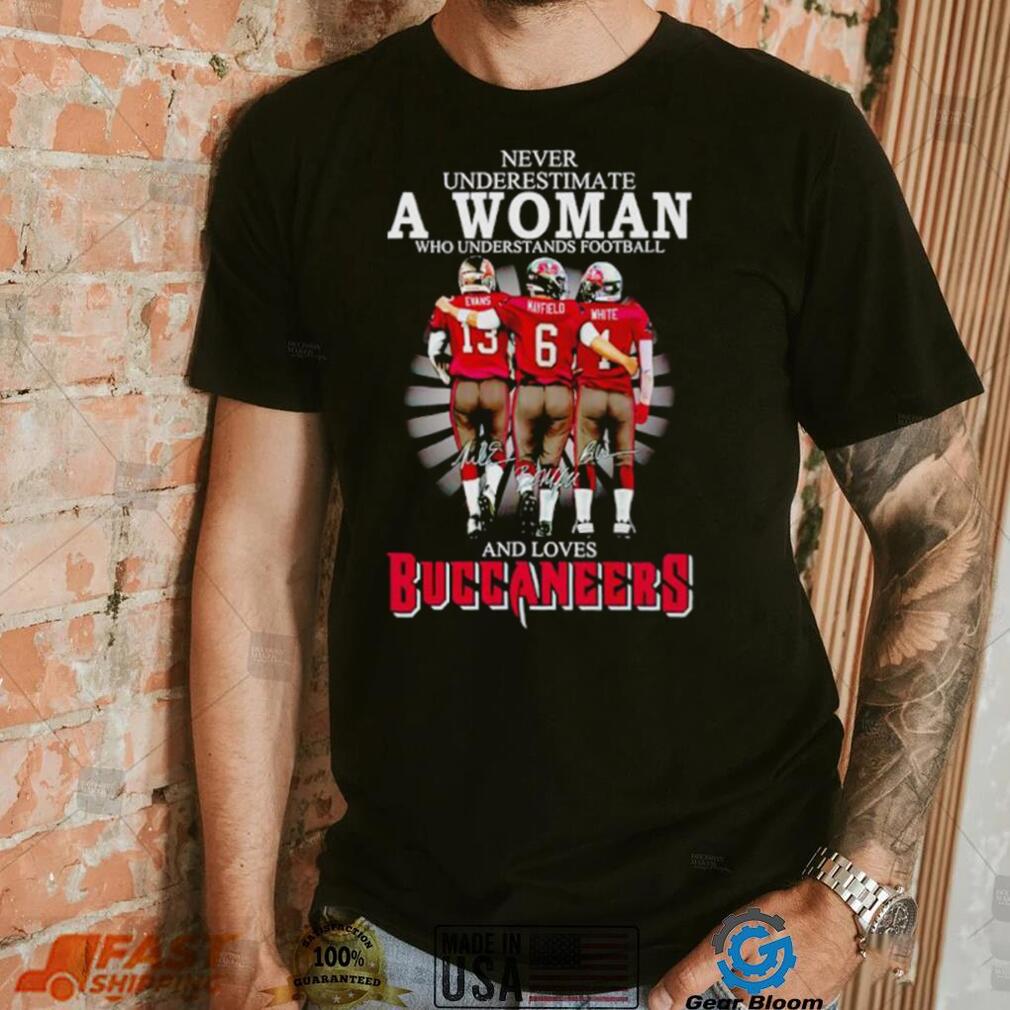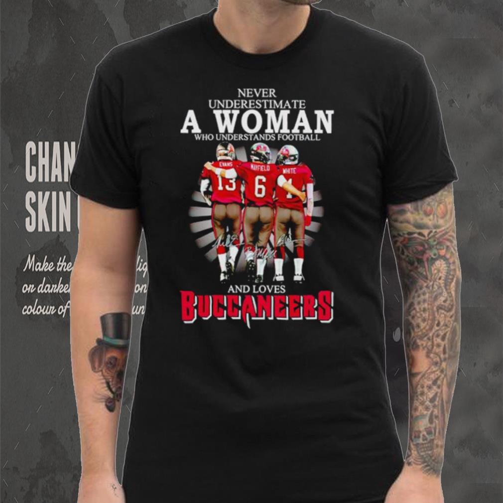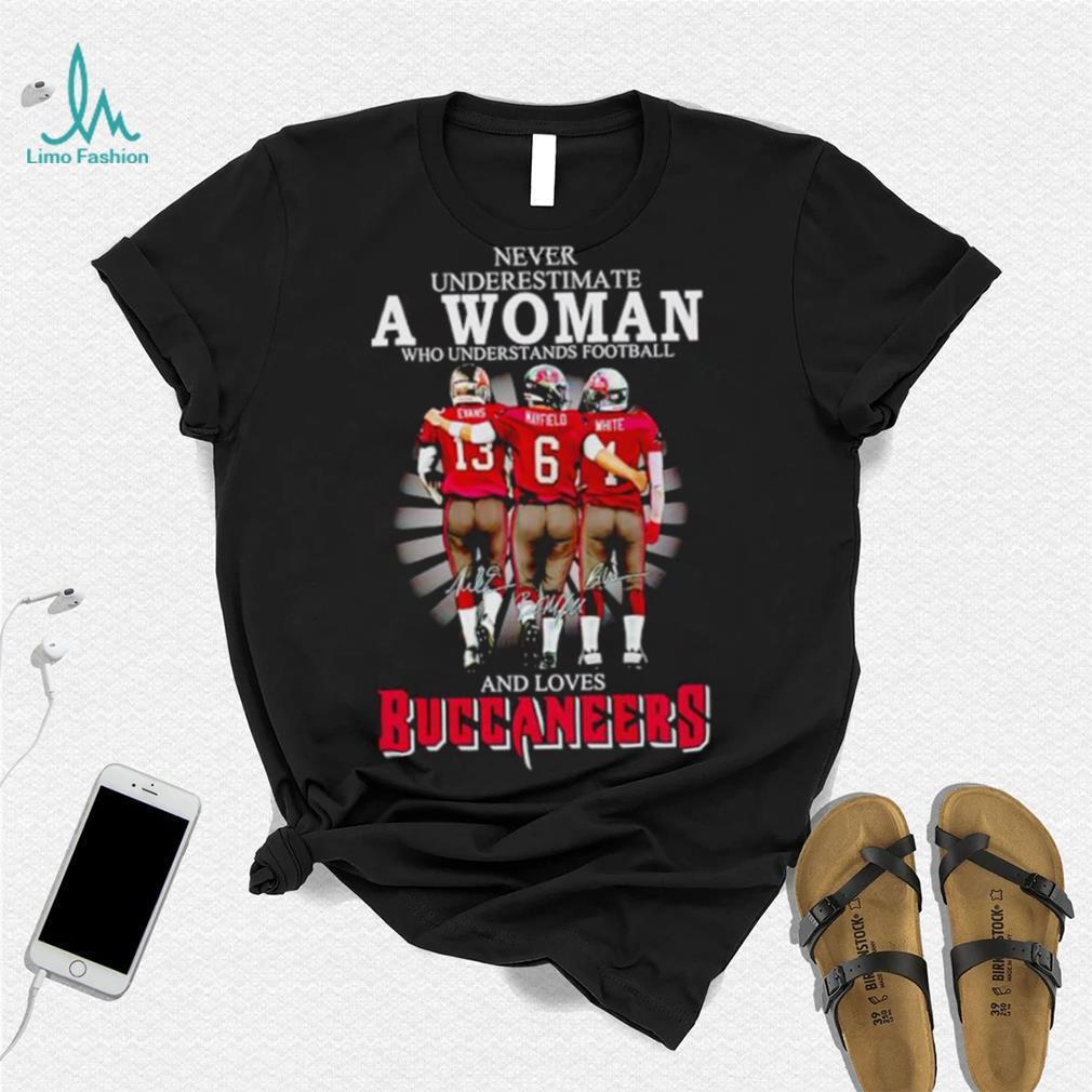 ()Spygate, 2007: New England Patriots get caught stealing signs from opponents` sidelines. This was actually not against the rules yet, so technically not cheating. They changed the Never underestimate a woman who understands football and loves Buccaneers signatures shirt after this to make it illegal. I won`t deny it`s a bit cheap (although you`re kidding me if you think the Patriots were the only team doing this), but not nearly as egregious as:Deflategate, 2014: During the AFC Championship Game, the New England Patriots were found to have several footballs in their arsenal that were below the legal minimum. Tom Brady had to testify before Congress and was suspended for four games the following season, despite the fact that the Colts, the team that Patriots beat in the game 45–7, noted that they didn`t lose because of the Never underestimate a woman who understands football and loves Buccaneers signatures shirt, and that the Colts had deflated footballs as well. For context, the weather was super icky that game, and it`s probable that both teams deflated the footballs to grip them better.