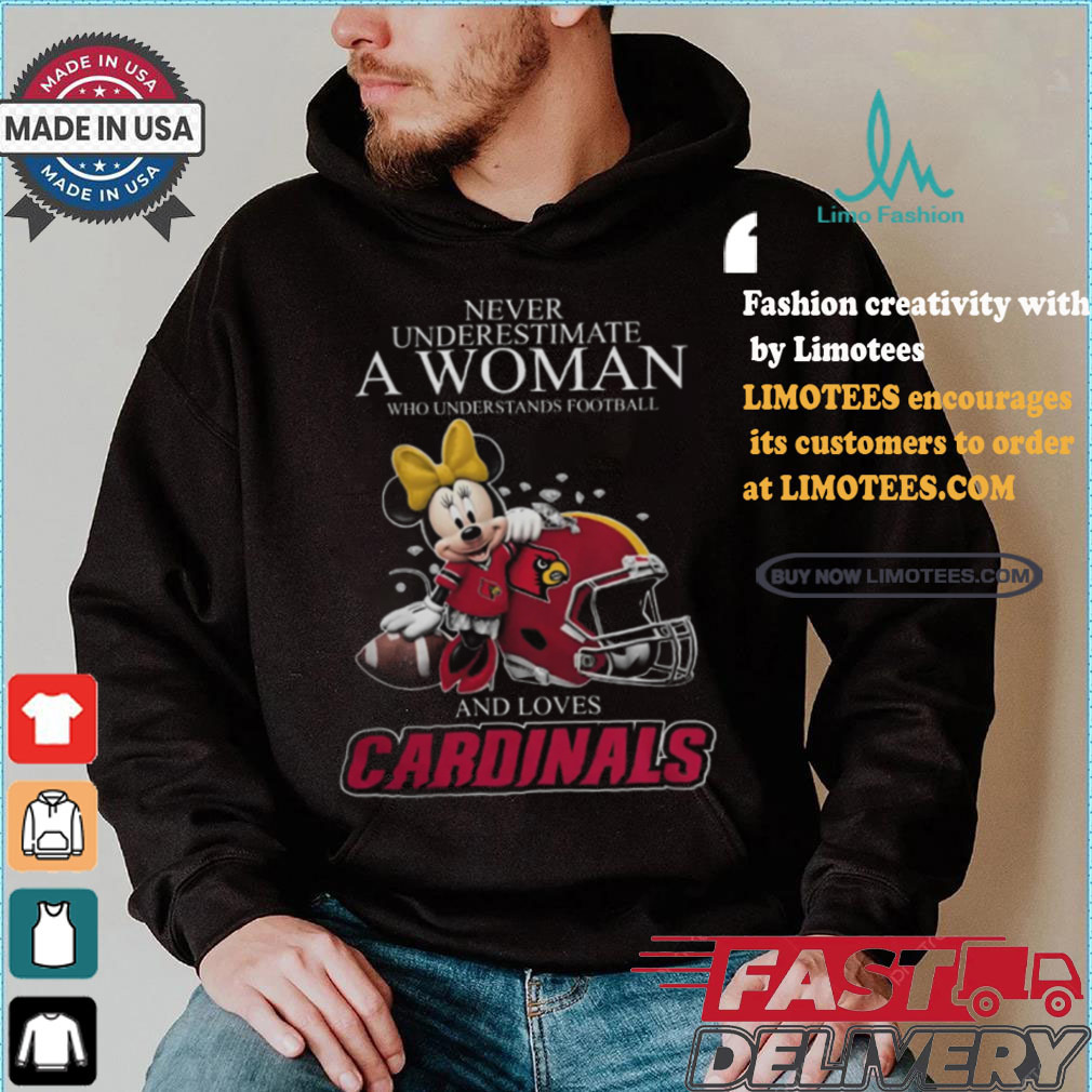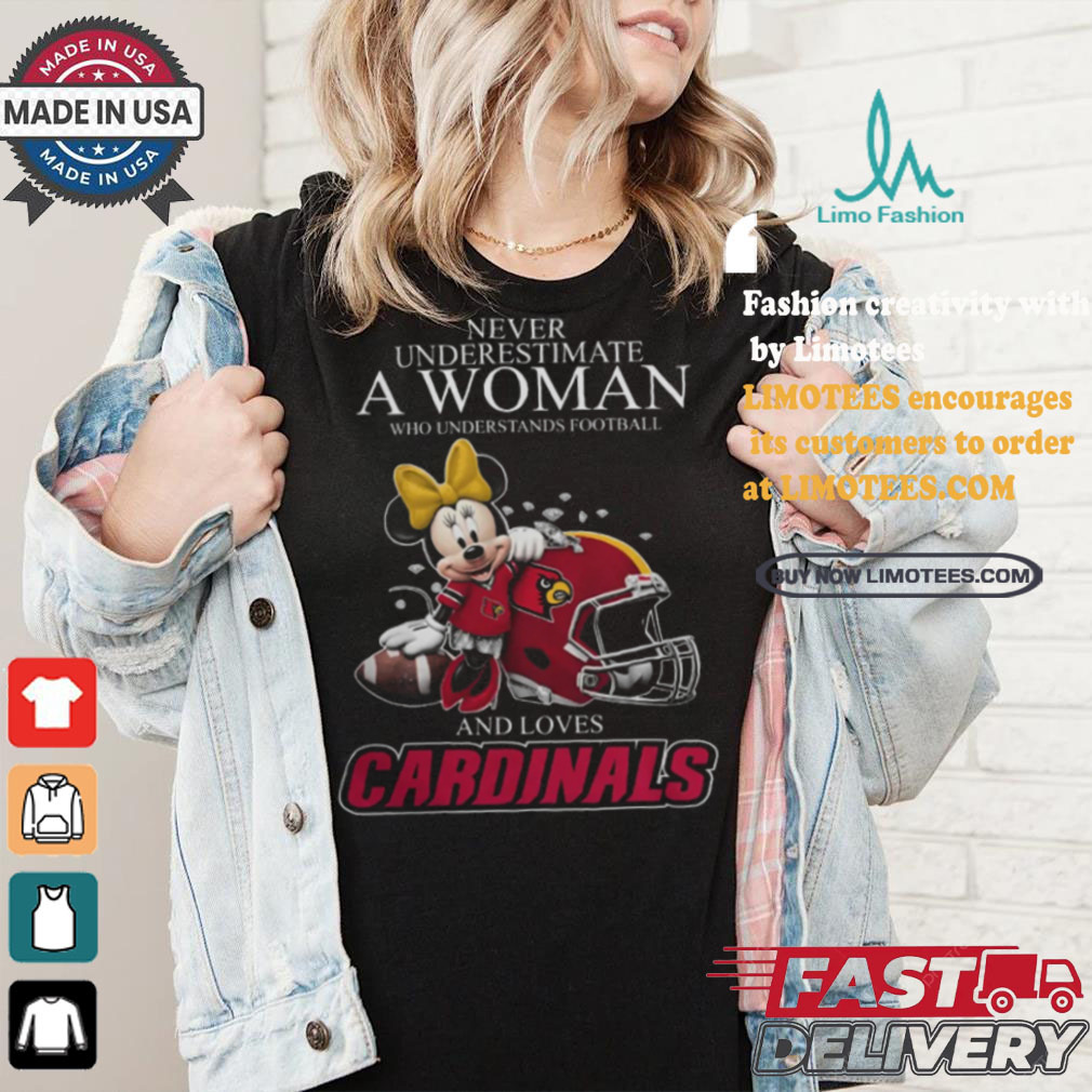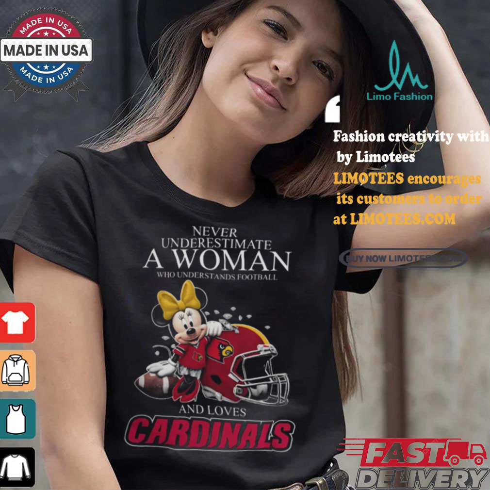 Around 11 AM, the Never Underestimate A Woman Who Understands Football And Loves Louisville Cardinals x Minnie Mouse T Shirt arrived. Several large, police officers approached us. They told us that they were going to shut down the operation as it was causing a huge traffic jam. I got a brainstorm, I asked the officer that appeared to be in charge if I could have a word with him (Note, I was in my hippie mode at this time). He agreed. I said, “These trees are free to anyone.” He said, “So what” I said “there are free to anyone, including the police department. You could pick up as many of the trees as you want and take them down to Watts (a very poor part of town) and give them away. Think of the PR you could get out of that.” The lights went on in his head and he turn around and talked to the other officers. I do not know what he said, but in a very short time, there were a lot more officers, but they were now directing traffic. Soon a large truck from the police department pulled up and they starting filling the truck with tress. They were already sending in an advance unit to prepare for the Christmas tree give away.