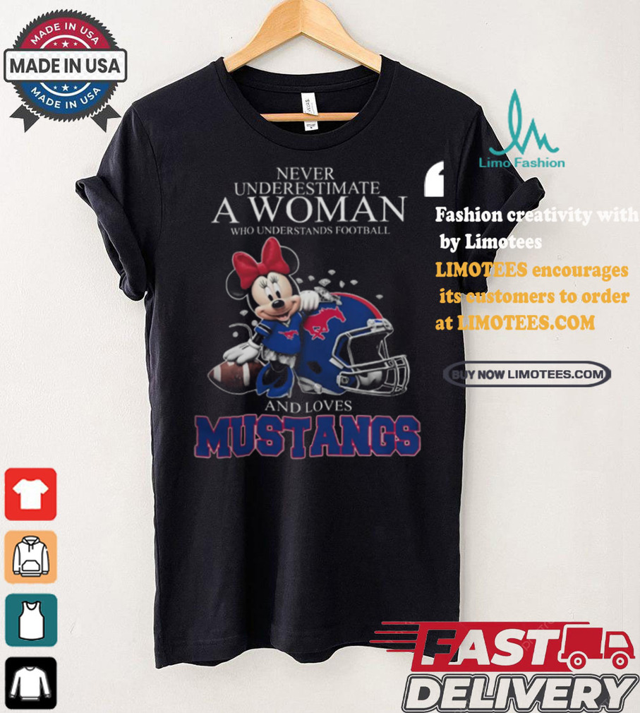 Never Underestimate A Woman Who Understands Football And Loves SMU Mustangs x Minnie Mouse T Shirt