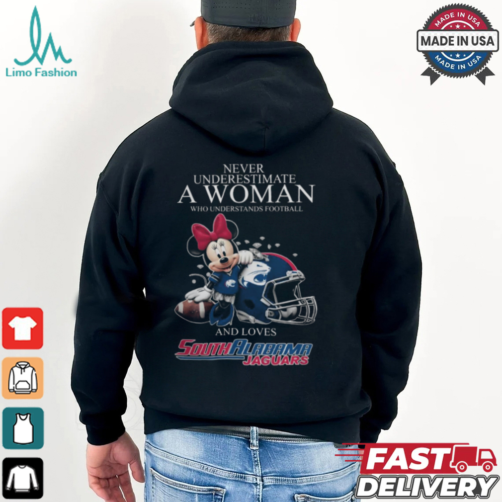 Never Underestimate A Woman Who Understands Football And Loves South Alabama Jaguars x Minnie Mouse T Shirt hoodie, tank top, sweater and long sleeve t-shirt