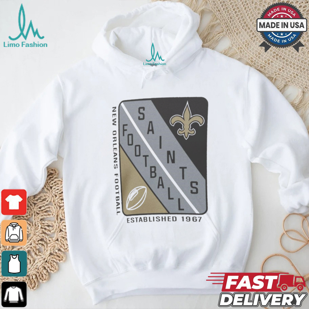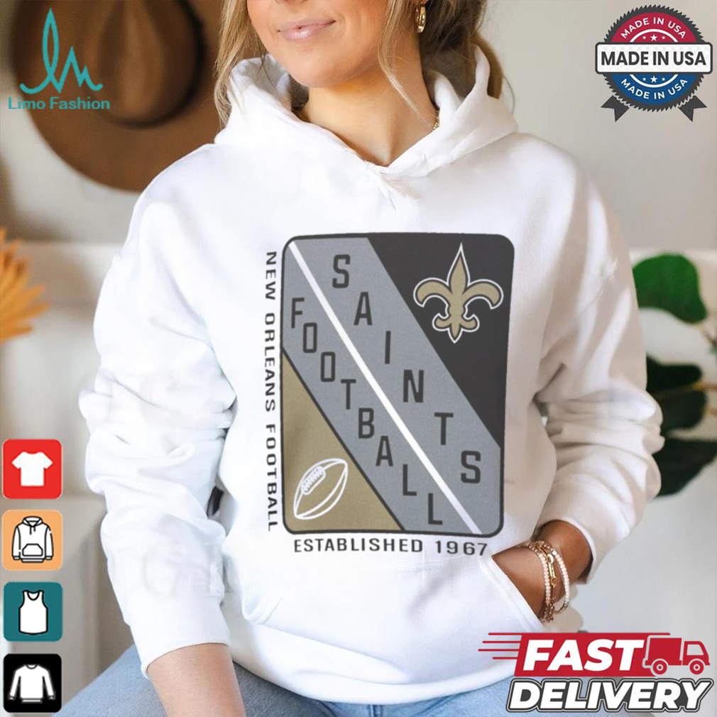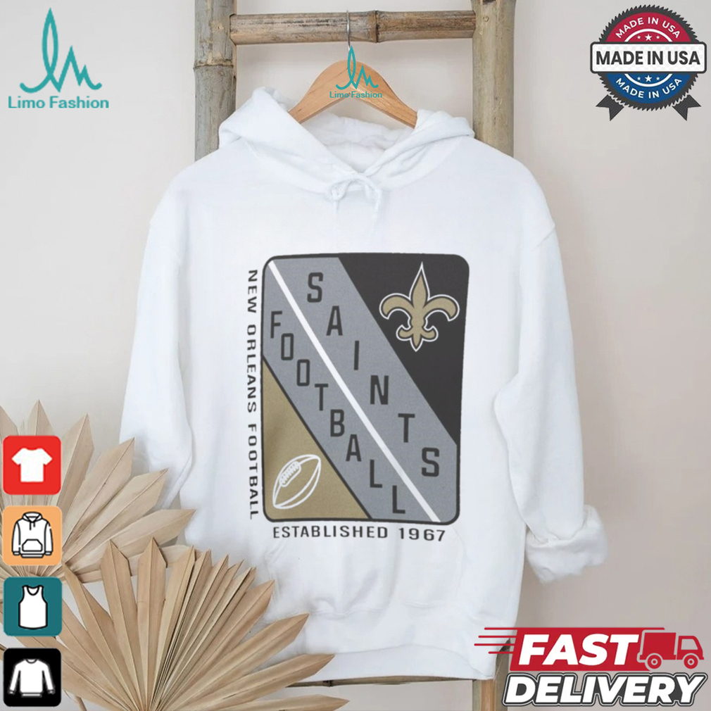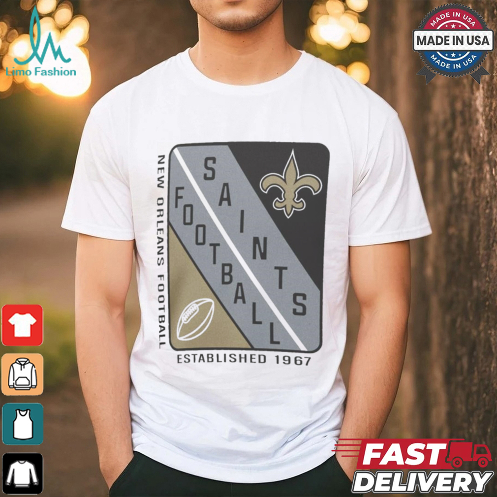 The Marvel Studios movies are known for New Orleans Saints Starter Shield Logo T Shirt, light hearted tone, and easy going nature. Like the first film, this film had jokes in it. But I found myself not laughing. A few worked, like when Mantis got hit by falling debree in the final third act battle. But Rocket’s humor was not funny, Star-Lord and Gamora flirting did not amuse me. Sure- some things were funny- some Baby Groot moments were hilarious, that Mantis scene again, Drax and Mantis had a few funny scenes, and when Star-Lord and Rocket were arguing about tape- I guess that was funny, but other than that- most jokes just didn’t land. It was a shame, cause the first movie was so damn funny. But this movie was also so slow. There was barely any action. Majority of the film takes place on Ego’s Planet, and shows Drax falling in love with Mantis, Peter and Gamora getting closer together, and Peter getting to know his father. Whilst the relationships would otherwise be interesting to watch progress, they didn’t progress in the way I wanted. It was really Rocket, Baby Groot, Yondu and Nebula- they are the main characters in this film- Peter, Gamora, Ego, Drax and Mantis all are backseat players for this film. But the action we got also felt lackluster and had way too much CGI, almost like a DC movie. It was either too little action, or too much CGI in the action. The only good action pieces were between the sisters Gamora and Nebula, who had a great cat & mouse story in this film.