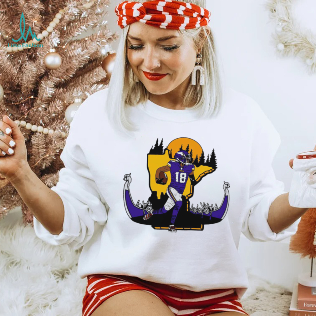 At that point I had a steady girl-friend, but also a NFL Minnesota Vikings football Justin Jefferson player number 18 signature cartoon retro shirt good friend Robin. I was suppose to meet my girl-friend on Christmas Eve, but around 7:00 PM my friend Robin calls me up and tells me her mom has been bummed about about Christmas and there are no decorations at their home. She asked me, “Will you go get a Christmas tree with me?” That put me in a real dilemma with my girl-friend, but sometimes you have to do the right thing…so I called my girl-friend and told her what I had to do, she was cool. My friend Robin had lost her father when she was very young, and her mother never remarried her entire life. I sort of knew why because one day while over Robin’s house, she had a box of letters that her dad had written to her mom while he was a soldier, and we read them together…very old letters, but expressed who he was.
