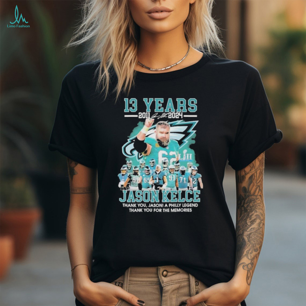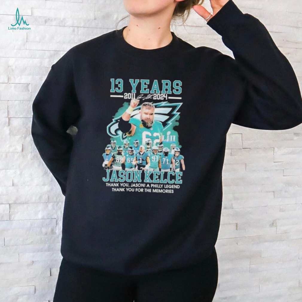Mental Aspects: Another part of why NFL runner-ups don’t make it back to playoffs clearly seems to be mental, however, and it’s hard to say how the Falcons will cope with getting that close to the championship and having it slip through their fingers, especially in such a Official 13 Years 2011 2024 Jackson Kelce Thank You Jason A Philly Legend Thank You For The Memories Signature Shirt fashion. There are players like second-year LB Vic Beasley (who had 0 tackles, and could have intercepted the Pats in OT to stop their game-ending drive, but only got one hand on the football and tipped it away) who will no doubt have some negativity and frustration—both external and internal—to deal with after this game. There’s also a new Offensive Coordinator, as Kyle Shanahan has left to take the head coaching job in San Francisco. It usually takes a couple of years for a new OC to really get the freedom and familiarity with his players to institute major changes, so we can expect the Falcons O to look very similar to this season’s, with perhaps a couple of Official 13 Years 2011 2024 Jackson Kelce Thank You Jason A Philly Legend Thank You For The Memories Signature Shirt installed by new OC Steve Sarkisian. No one rocks the boat too hard first year, however, so not too much should change.