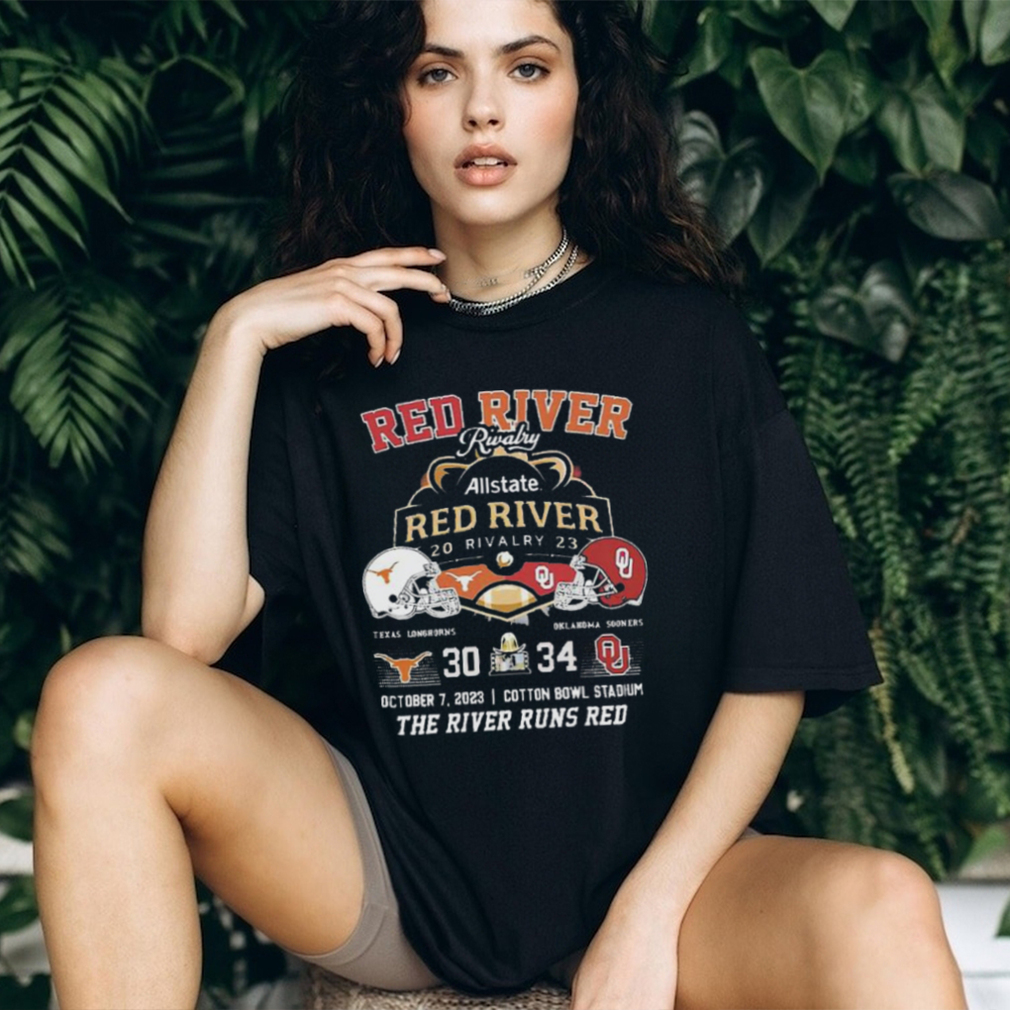Official Allstate 2023 red river rivalry Oklahoma sooners the river runs red 34 october 7 T shirt, Hoodie, Sweater, Vneck, Unisex and T-shirt