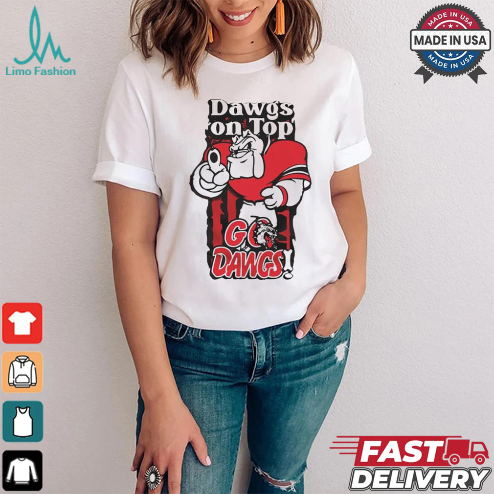 Christmas decorations are a Official Georgia Bulldogs Football 2024 Dawgs On Top Go Dawgs Shirt affectation. Whether one puts them up or doesn’t put them up, whether one leaves them up or takes them down, whether they are put up in January or any other time before December, has no impact on the superstition defined as luck. Good luck and bad luck are merely characterizations of serendipitous occurrences that are random in nature but which leave us either going hooray (good luck) or lamenting the vagaries of uncaring nature (bad luck). But worrying about or praying about or hoping for either as the case may be, like astrology for example, is simply superstitious dreck. As a native yo the city I must say there are three a places that I would suggest to visitors to really get the best holiday scene amd spirit. My first pick is going to be Westfield Mall’s extended outdoor shopping area Union Square. Located at the corner of Powell and Geary in the heart of downtown San Francisco the Christmas spirit is reminiscent of the movie “A Miracle on 24th Street”. That is minus the snow.