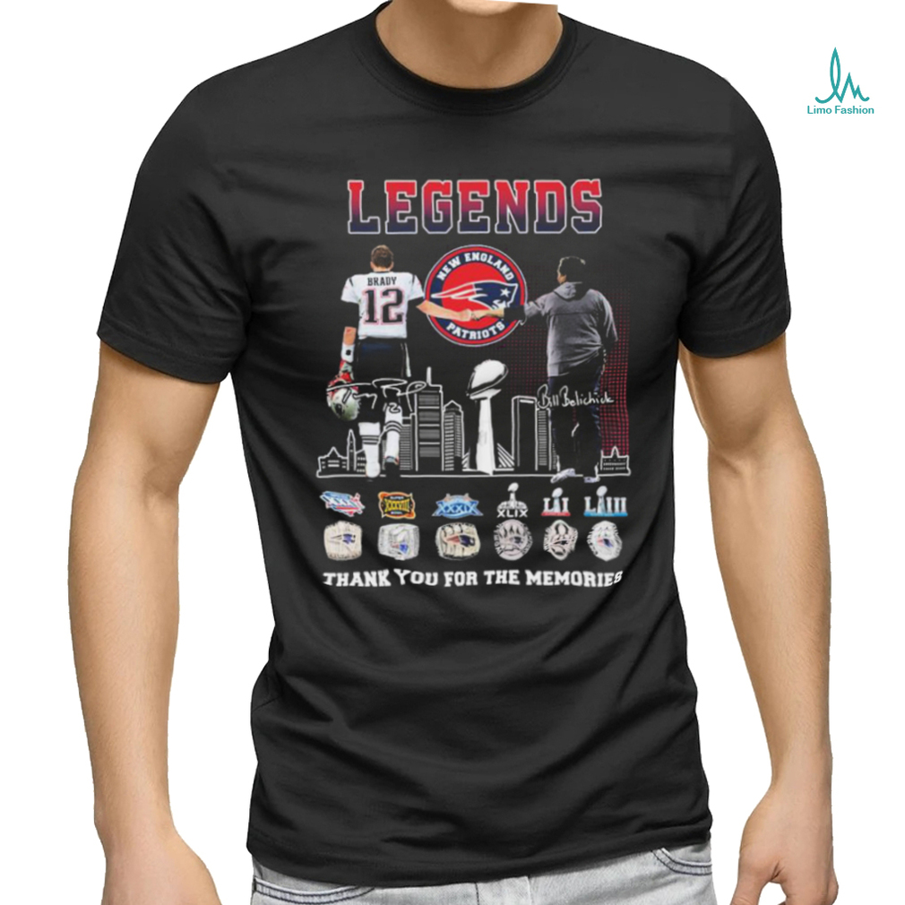 My mother confirmed later, that when she worked for the state’s Official legends Tombrady And Bill Belichick New England Patriots Thank You For The Memories Signatures Shirt office, these properties were held for generations by families whose ownership couldn’t be easily determined due to inbreeding. I also met a man a couple of years later who worked for the department of public works. He told me he had to go out to these properties occasionally and had observed some outrageous behaviors among the Pine Barrens families that seemed to reinforce what my mother had said – that it scared him to the point that he told his boss that he wouldn’t go out there any more, even if it meant losing his job. He told me this before I even mentioned the camping trip incident. True or not, it creeped me out for certain! Either that, or worse, we could have run into the ‘Jersey Devil’! Never made another trip to that part of the state again…