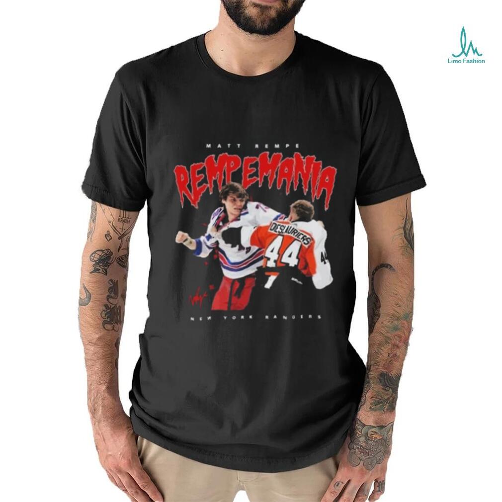 The Devils were playing the Tampa Bay Lightning in the 2nd round of the 2003 Stanley Cup playoffs, in game 3 it was already clear that the New Jersey Devils were the Official Matt Rempe Rempemania New York Rangers Signature T shirt hockey team thus they ultimately were going to the next round; the Tampa Bay Lightning were a psychologically beaten team. Early in the first period of Game 3, a frustrated Pavel Kubina flung an eye level dump-in shot from inside the blue line that sailed high and hit the stalwart Devils defender on the side of the face. The shot opened a cut near Stevens’ left ear that required 15 stitches. The Devils captain left the game and didn’t return. Stevens returned the next game, and led the Devils to victory over Tampa Bay & went on to lead the Devils to their 3rd Stanley Cup. Scott Stevens was never the same after getting hit in the head with that shot. He had to retire in early 2004 because of post-concussion syndrome from getting hit in the head with a hockey puck. His Hall of Fame Career was cut short & an end to the New Jersey Devils reign of superiority that began a decade ago. The end of a dynasty because of a guy getting hit in the head with a hockey puck.