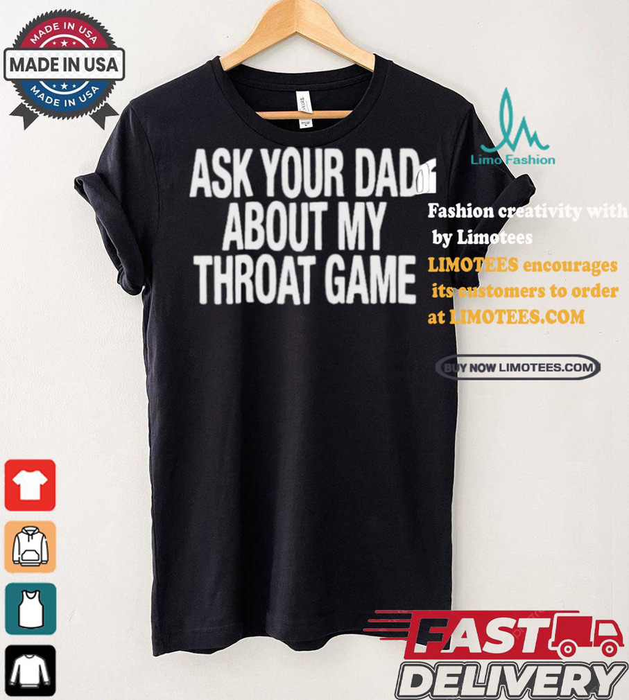 It’s a Official Official Ask Your Dad About My Throat Game Shirt kid’s movie that adults can enjoy. The only bad language is done in a cutesy way, with unintelligible sounds, kind of like the adults always talked in Peanuts cartoons. Ralph gets his mouth washed out with soap for it. The only violence is a scene where Ralph, while being picked on by a bully, snaps and fights back. It isn’t overly violent, and it isn’t glorified fighting, it’s just a couple of kids fighting in the snow like kids do. Ralph is crying throughout, so it is not some kind of ‘Aha, the victim has turned the tables with violence!’ I think the only other scene of violence is where Ralph fantasizes that he defends the house from burglars in the backyard with a BB gun. The scene is in black and white and sped up like a funny silent movie, and the burglars wear comical, old timey burglar outfits – striped shirt and black masks, like the Hamburglar. I think Ralphie shoots them in the butt as they try to climb back over the fence to get away.