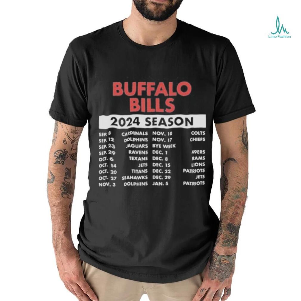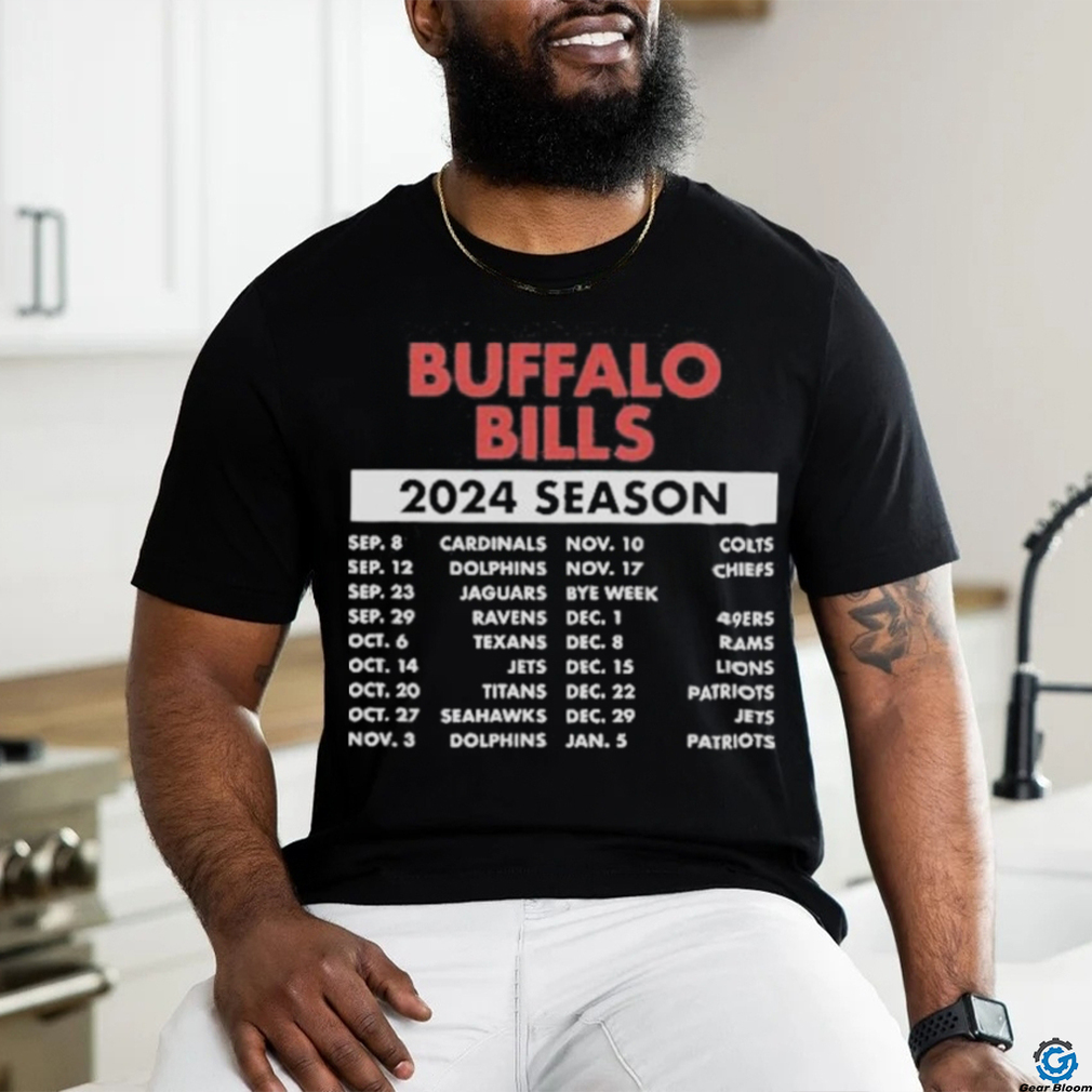 The Neutral Zone Trap started with one forward pressing with a Official Official Buffalo Bills Schedule 2024 Season Shirt forecheck, usually not going any deeper in the offensive zone than the high slot in order to be able to retreat back to the blue line when the opposing team was breaking out. The other four players would stay spread out between the two blue lines totally plugging the neutral zone. As long as a team was committed to a passive forecheck and stayed in position it worked almost too well. The Left Wing Lock is a bit different. Basically once the puck changed possesion, the left winger on the defensive team would retreat to almost playing defense creating on the left side (right side to the team with the puck). Given that about 70% of players shoot left, giving up that ice would would put most players on their backhand causing them to kind of have to always to be looking behind.