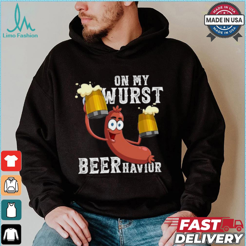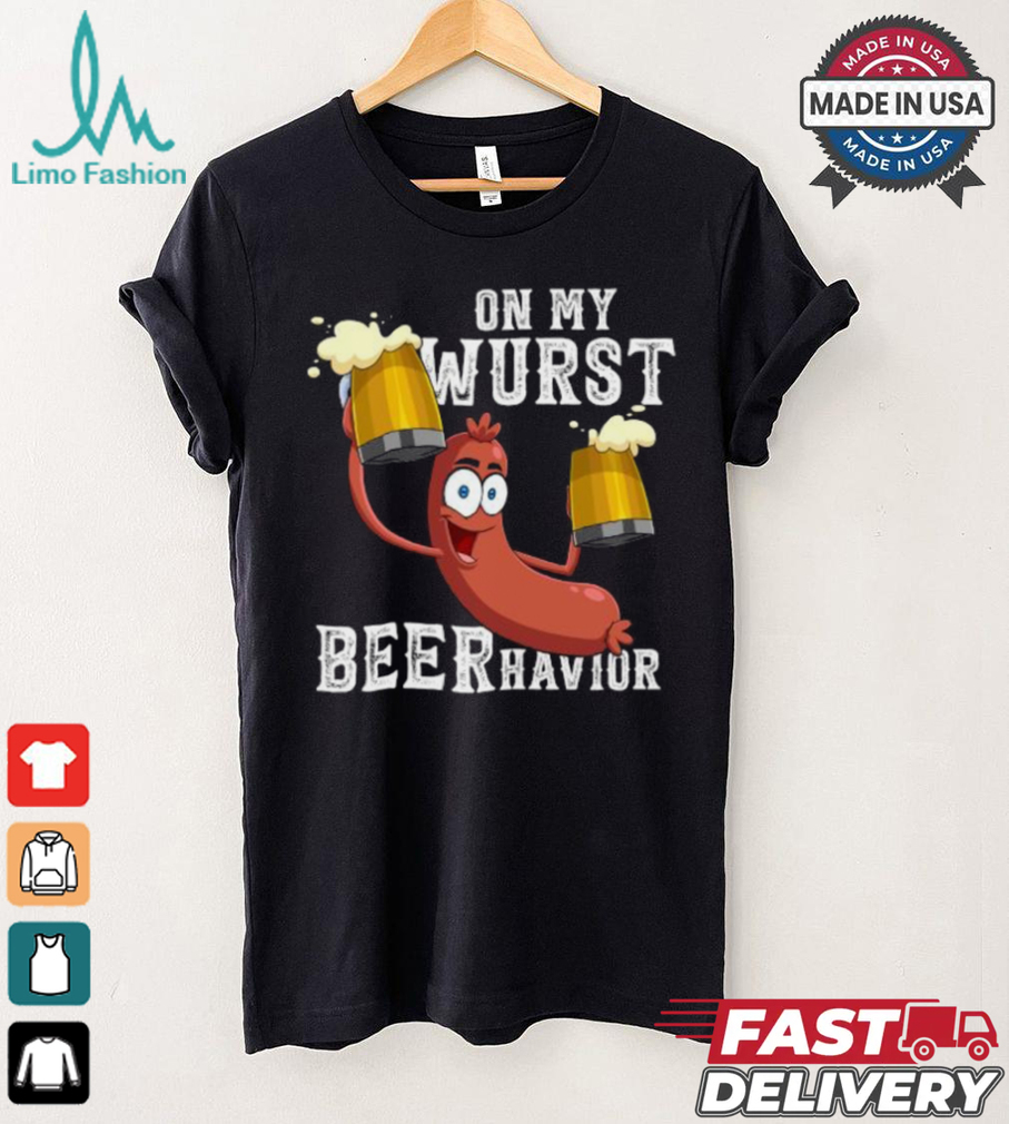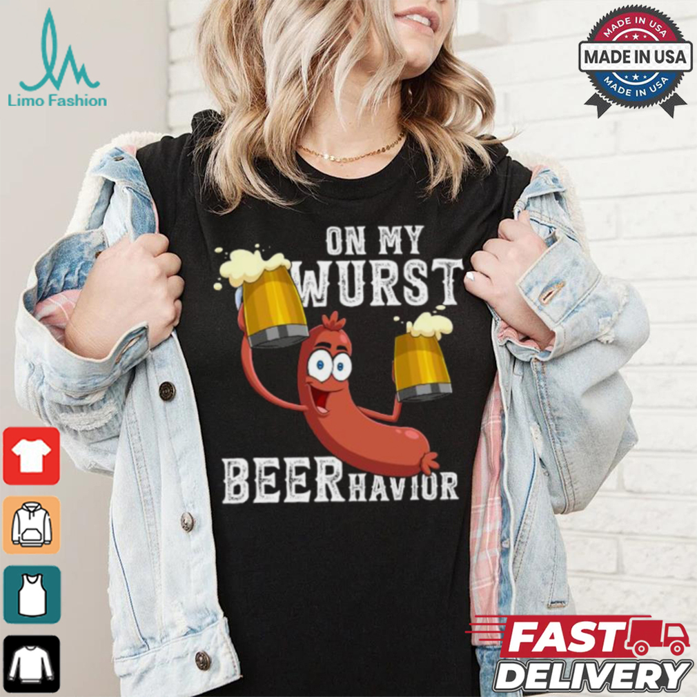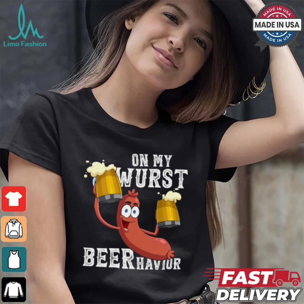 When I was quite small, my family were Jehovah’s Witnesses. My big brothers remembered their Catholic beginnings, they remembered magical Christmases. My little brother and I did not, we’d never been Catholic yet. We used to get very sad that all of our friends had lovely Christmas or Hanukkah, and we did not. We’d pout. My big brothers tried their best to console us. Our best friends lived across the Official On my wurst behavior beer schnitzel oktoberfest costume T shirt . Their dad was not home much, but he was a very stern man. He had quite the temper (when we grew up, we realized that he was always drunk, but when we were small he was just scary). He had a Doberman called Rex who we were all also terrified of. One year, I’m probably four or five, we’re sitting in my brothers’ room wistfully staring out the window at our friends playing with their new toys, wearing their Christmas sweaters, all that. The oldest two brothers, maybe trying to console us, convince us that we do not want Christmas at all. They tell us that Scary Dad is Santa Claus. They tell us that Rex the Doberman is actually Rudolph. Would we really want Rex landing on our roof? Would we really want Scary Dad judging whether we were naughty or nice, and sneaking into our house while we slept?