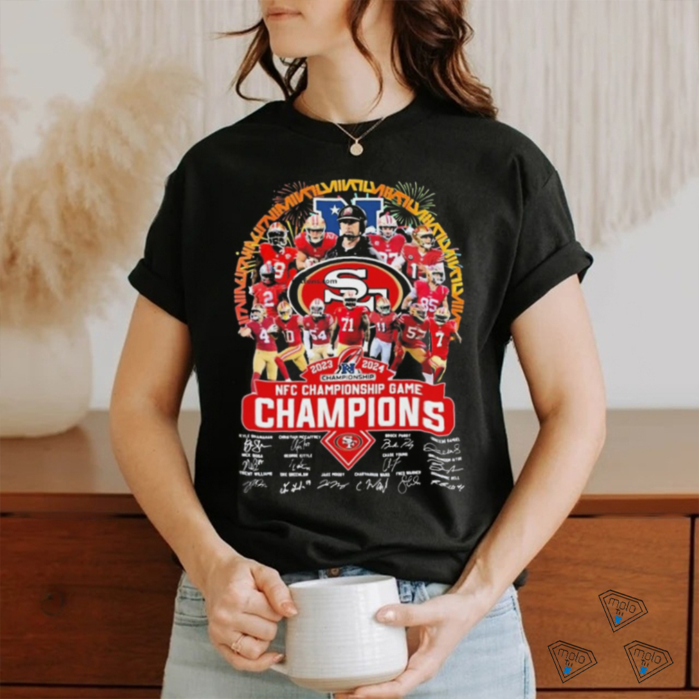 I’ll bite. The air pollution, at least in Beijing, makes a lot of Official San Francisco 49ers 2023 2024 NFC Championship Game Champions Signatures shirt and Inner Mongolian coal barons very rich. It also makes steel magnates in Hebei very rich as well. These industries A) have lots of workers attached to them who would be unemployed and very angry if they were completely shut down, though this is a bit of an extreme solution and B) have lots of clout within the diffuse political machine that is the Communist Party and the government of China.To a lesser extent, on emmision standards on large vehicles are unenforced, which is noticeable in major cities by having a consistent late night spike in PM 2.5 readings as the freight vehicles and construction vehicles entire the city proper to work at night. These lax enforcement of emmision standards can be traced to the influence of the oil industry which still has clout within the government from its days as the Ministry of Petroleum, and auto manufacturers. Both make large sums of money from these practices, have lots of workers attached to their industry, and wield considerable political clout.