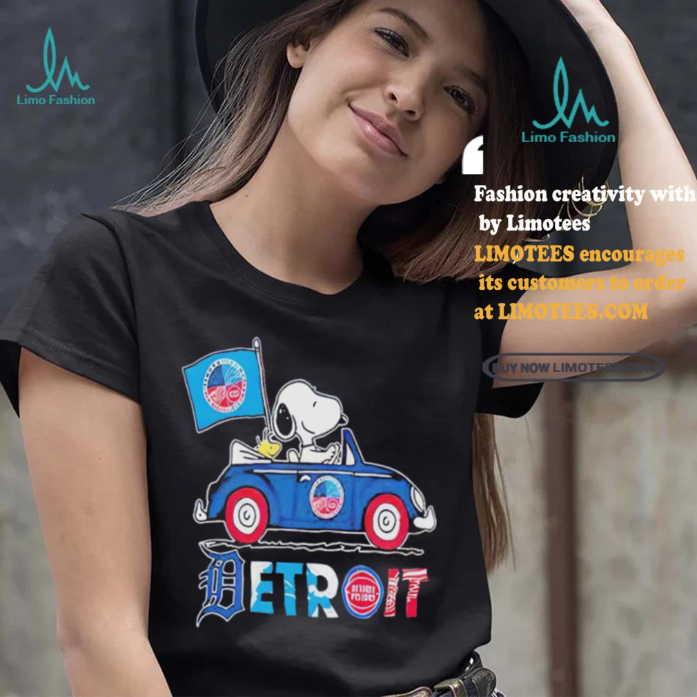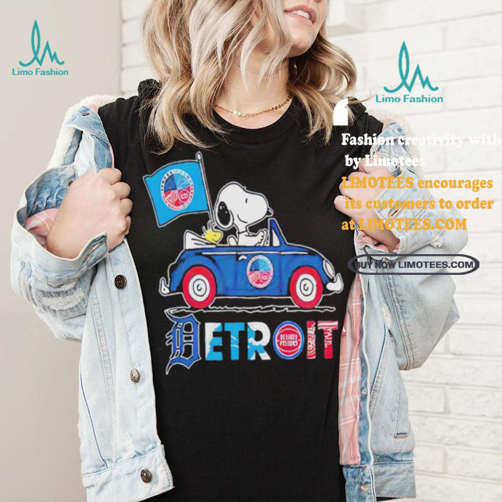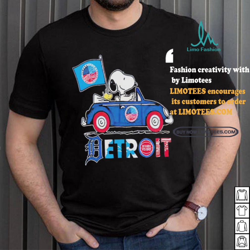 Official Snoopy And Woodstock Driving Car Detroit Sports Teams Flag T Shirt