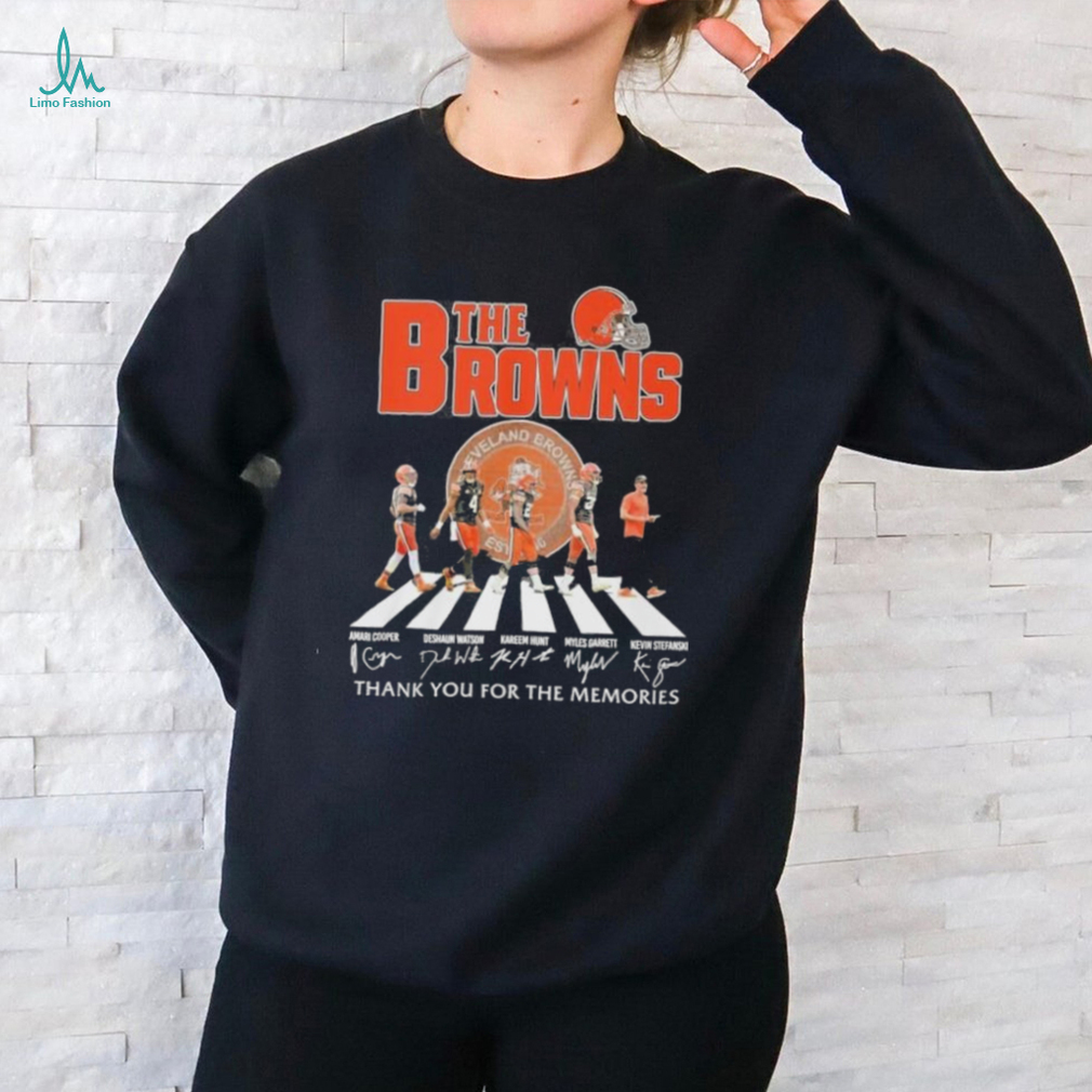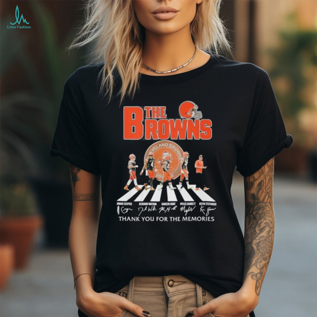 Now and again, playing some Official The Cleveland Browns Abbey Road Thank You For The Memories Signatures Shirt sound assistance decrease yelping. There are numerous CDs for hounds who need unwinding. A pheromone diffuser might be useful on the off chance that you as of late protected a canine and it is making some hard memories adjusting to new commotions and scents. Mutts will in general bark less whenever permitted to remain in the home versus kept in the yard throughout the day. Canines are pack creatures and flourish with human friendship. It is imperative to place some exertion in deciding why your canine is yapping so to help diminish the woofing in any case. Heading off to the base of the issue is vital.