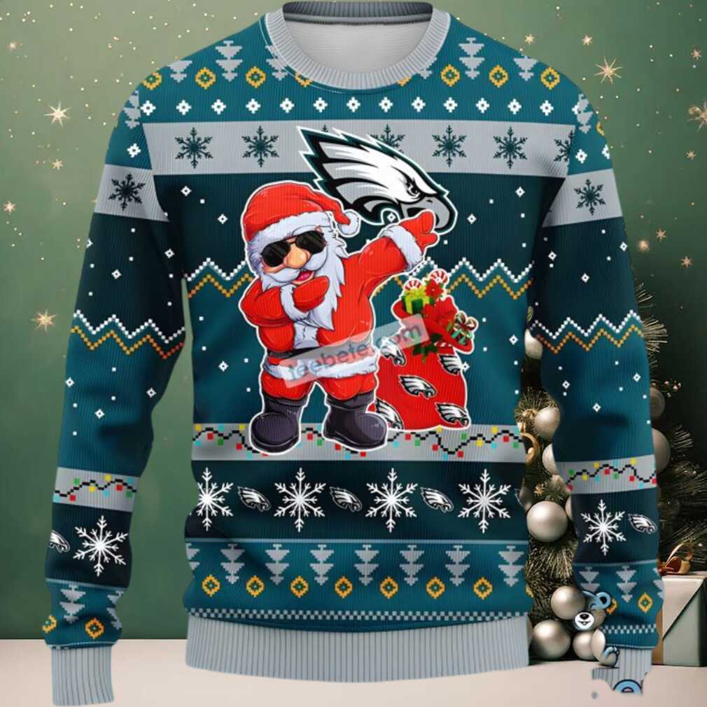 To keep your Philadelphia Eagles Dabbing Santa Claus Ugly Christmas Sweater looking its best, machine wash cold and tumble dry low. Avoid using bleach or ironing directly on the design. With proper care, this sweater will be a treasured part of your holiday wardrobe for years to come!
