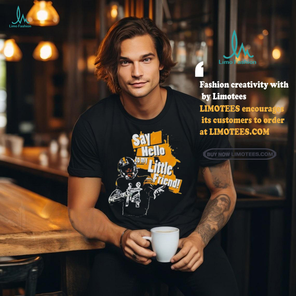 I told her, Well, I just I need to Pittsburgh Steelers George Malik Pickens Jr Say Hello To My Tittle Friend Shirt this one who chose me. She gasped, as the kitten was still holding on to me,patiently waiting. He let the girl get him from the cage and then climbed into my arms and looked at me as if to say, “Well? Come on, let’s go home!” I knew then I was beaten! Less than two minutes looking at cats only to be chosen. Gonzo is a dork and also a very good boy. He was fully accepted by the two adult cats in less than a week. He causes chaos daily in the house. I would not trade him for anything! I think he was so smart to chose the biggest pushover in the room! Below of pictures of him as a kitten and now as an 18 pound force of nature.
