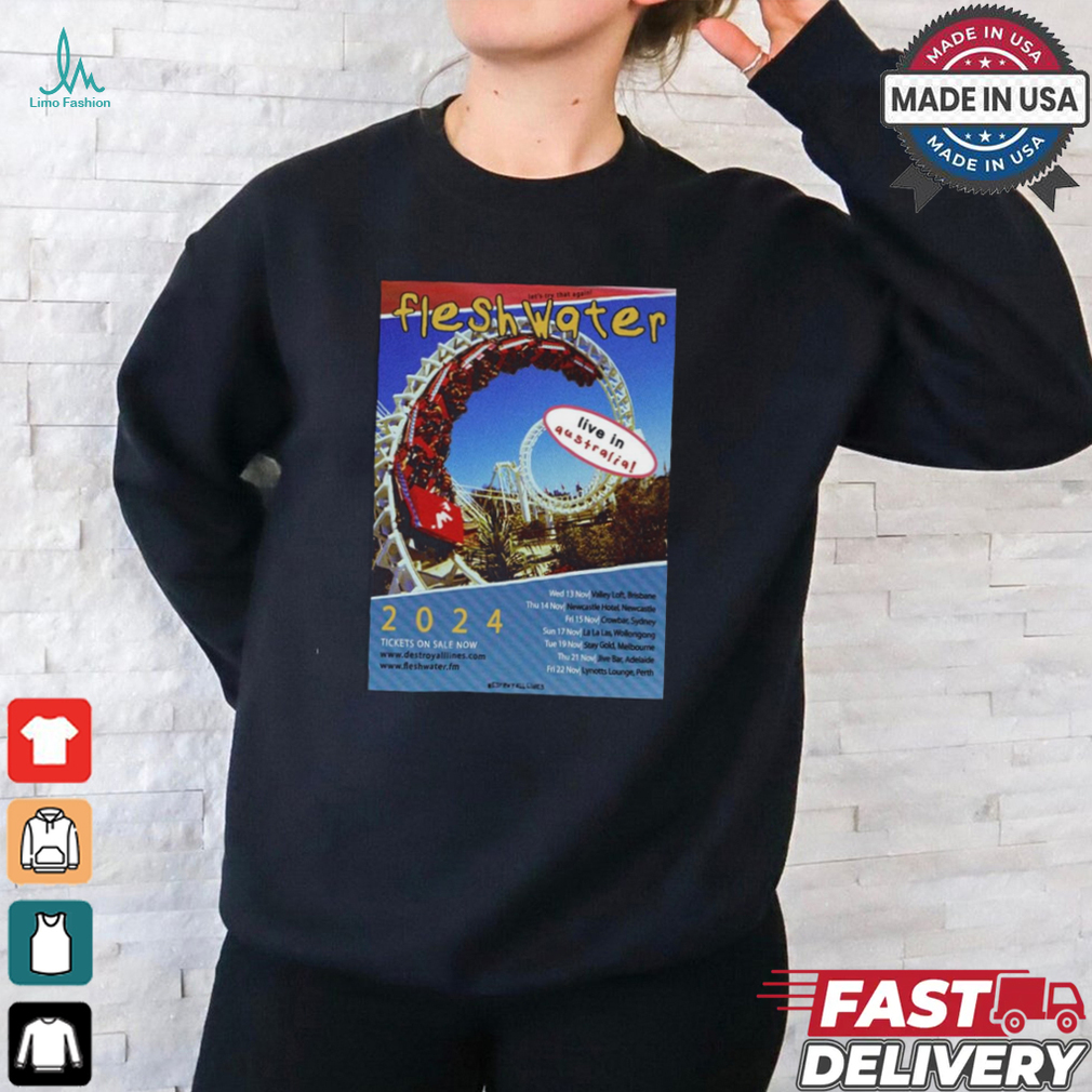 For more information regarding this Poster Fleshwater Australia Tour 2024 t shirt , you may consult with some professionals, who are much knowledgeable regarding all such aspects.These frames also come in handy when doing embroidery just not on the t-shirts or shirts on different angles but on fashion articles like purses and wallets, belts, dog collars too.If you get adjusted with the hooping, you can also then take the projects for such different kind of embroidering too.