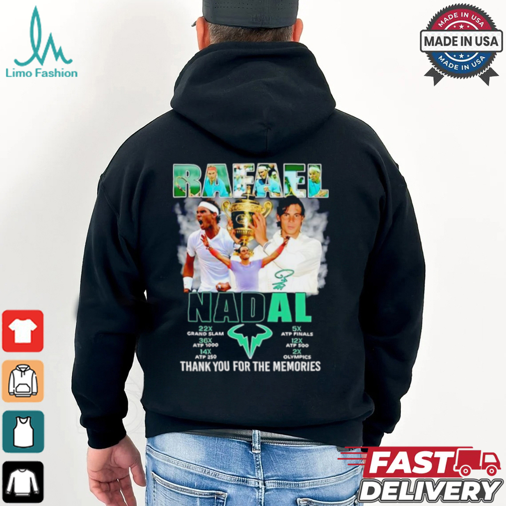 You see, Christmas Eve is really the Rafael Nadal 2001 2024 thank you for the memories signature shirt when my mom’s sisters and brothers would all gather in South Boston with their kids (My cousins of course.) Since they too were teens like myself back in the day, they all did their own thing on Christmas morning — But the one thing they didn’t want to do was leave their gifts after opening them. So Christmas Eve became more important to us as a whole to come together, celebrate and then visit midnight mass at the local church before going home. By the time I got home, it was after 1am, so I guess it was really Christmas morning if you want to get technical about it. The gifts were promptly opened and I was in bed no later than 3am to sleep most of the morning in peace. Now with two kids of my own, I will be getting up Christmas morning to greet the day and watch their faces. Mainly because Santa Claus is still important to them and he only visits on Christmas Eve when you’re asleep as all know.