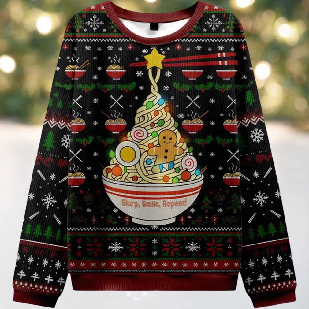 The Ramen Christmas Tree Slurp Smile Repeat Ugly Christmas Sweater is for the individual who considers ramen a lifestyle, not just a meal. It’s ideal for the foodie friend, the adventurous gift-giver, or anyone attending an ugly Christmas sweater party with a craving for something unique and delicious. Picture yourself wearing this while enjoying a festive ramen feast, swapping culinary tales, or simply spreading noodle-fueled joy – your sweater will be the highlight of the night. It’s also a memorable gift for friends and family who share your love for ramen and good times. More than just a sweater, it’s a celebration of flavor, festivity, and the universal love for a good slurp.