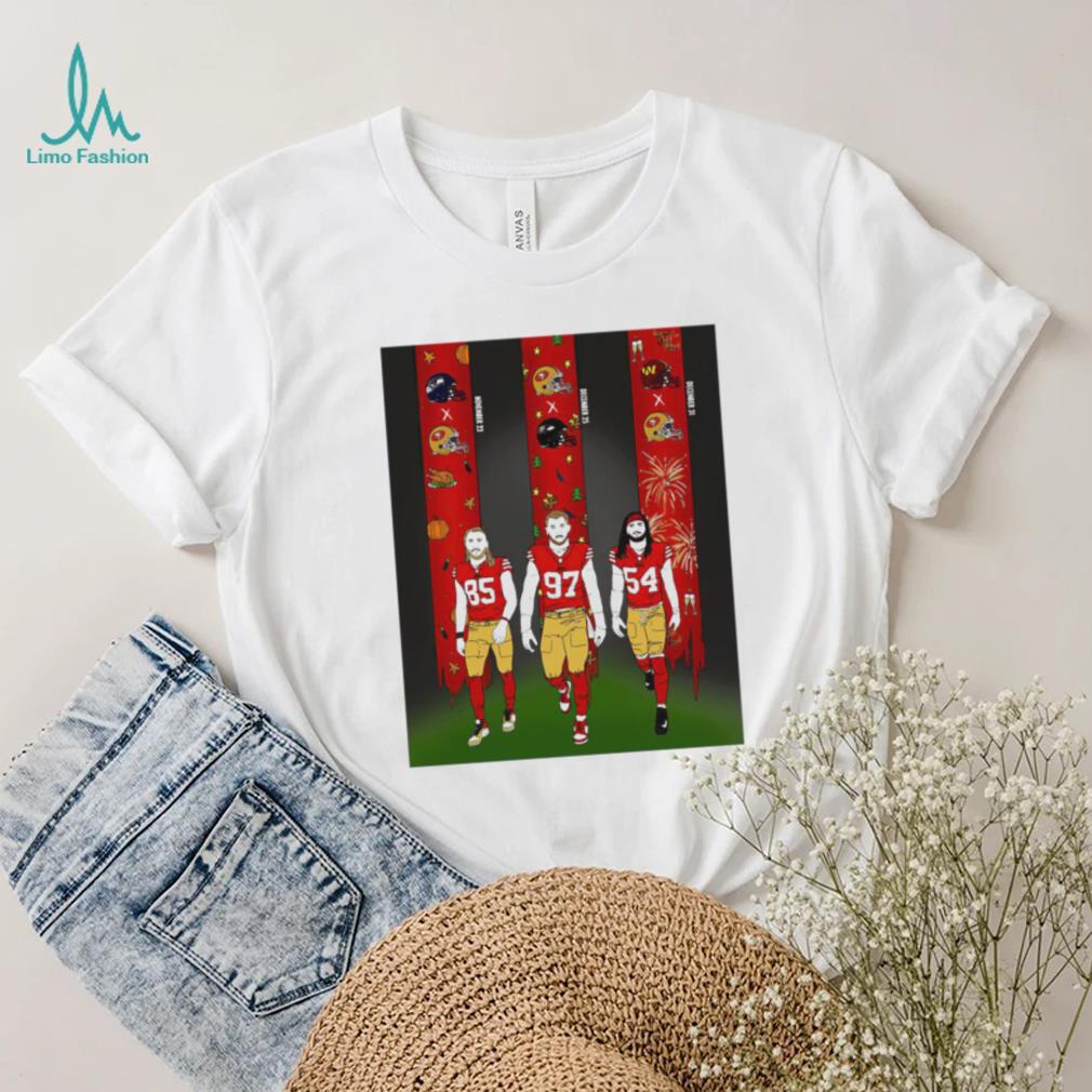 The truckers were speculator and had invested in the Christmas tree to sell to Christmas tree lots so they would have fresh trees. In the past years this had worked out very well, but because of all the San Francisco 49ers George Kittle Nick Bosa Fred Warner art shirt , no one wanted the tree. They were going to have to pay to bring them to the dump, so they decide to give them away. I asked the cop and the owner if I could find a place for them to move to, would let them go, it is Christmas. They agreed. I phoned the radio station (a long time before cell phones, this was done on a pay phone) I told them what the problem, the trees were free, but they needed some place to put the trees.