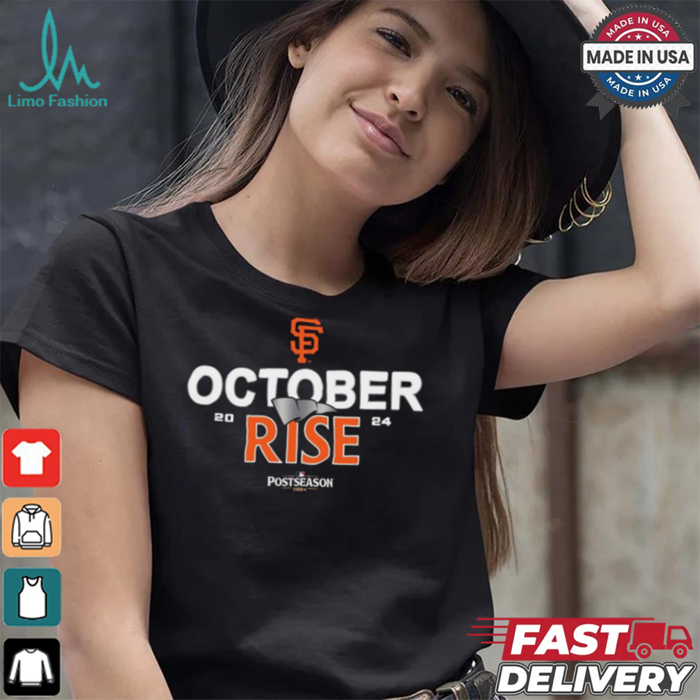 Everything that was in that movie is what my family did at Christmas. Mom and dad took my sisters, Lori and Tracy and I to see Santa so we could tell him what we wanted for Christmas. Yes the San Francisco Giants October rise 2024 Postseason shirt were long and my older sisters, two years older than me, would be with me looking after me as we moved up the line toward Santa and just like in the movie, the closer we got, the scarier Santa was. “Don’t be scared RJ, Santa is nice okay, don’t be scared now, we’re here,” Tracy would say as we moved closer. Of course that didn’t help me, but I was okay when I got there. I never cried. Mom and dad also took us to the Santa Claus parade. They made sure Tracy went pee before the parade because dad didn’t want to take her somewhere to find a bathroom during the parade. Something that he would have had to do if she didn’t go. And she went a lot. We would walk and look into the department store windows and see the toys and moving elves that the kids saw in the movie. Like Ralphie, I would get mom to order things for me from the comics, neat little gadgets they advertised.