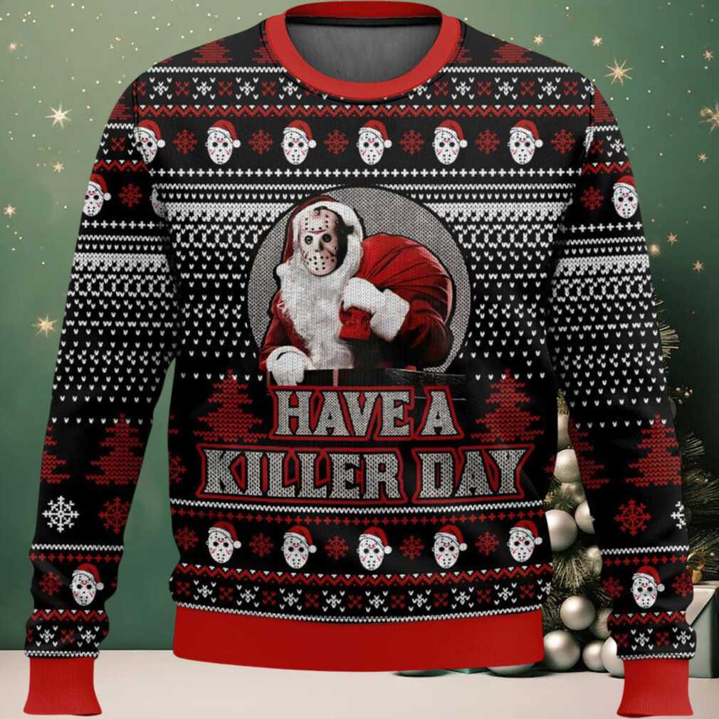 To keep your Santa Voorhees Have A Killer Day Ugly Christmas Sweater looking its best, machine wash cold with similar colors and tumble dry on low. Avoid ironing directly on the design to preserve its chilling charm for seasons to come.