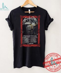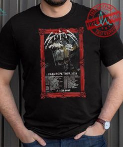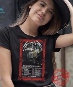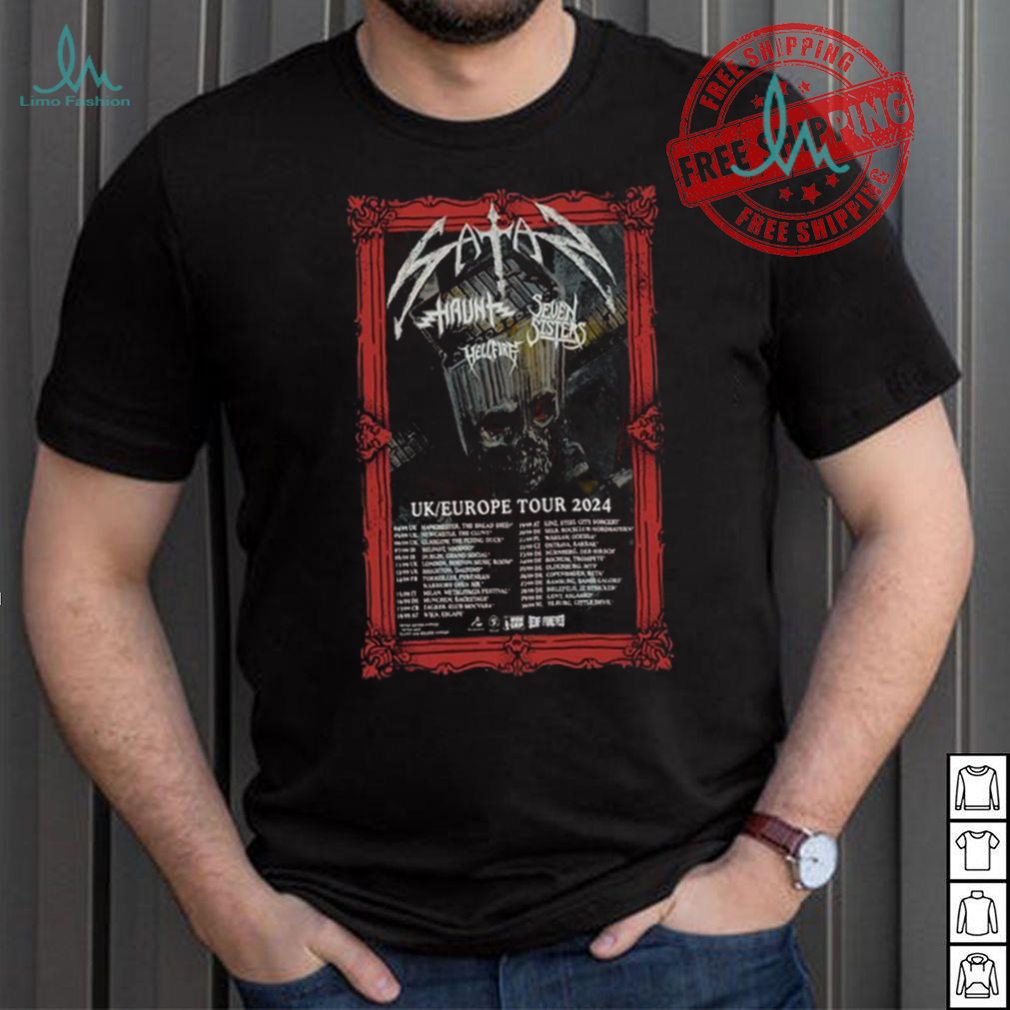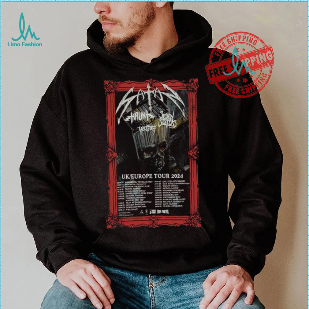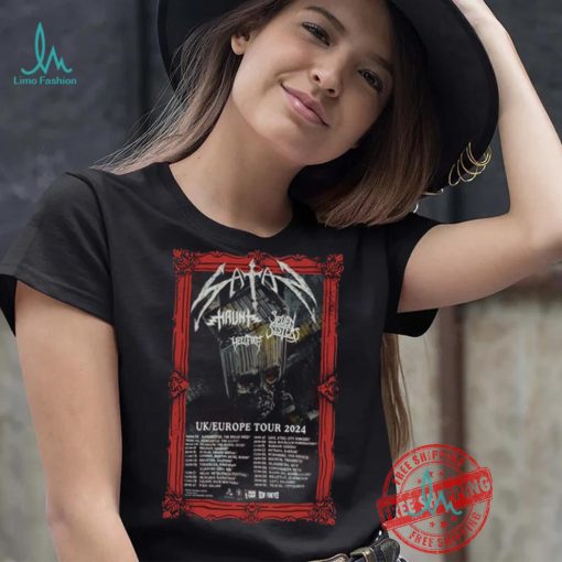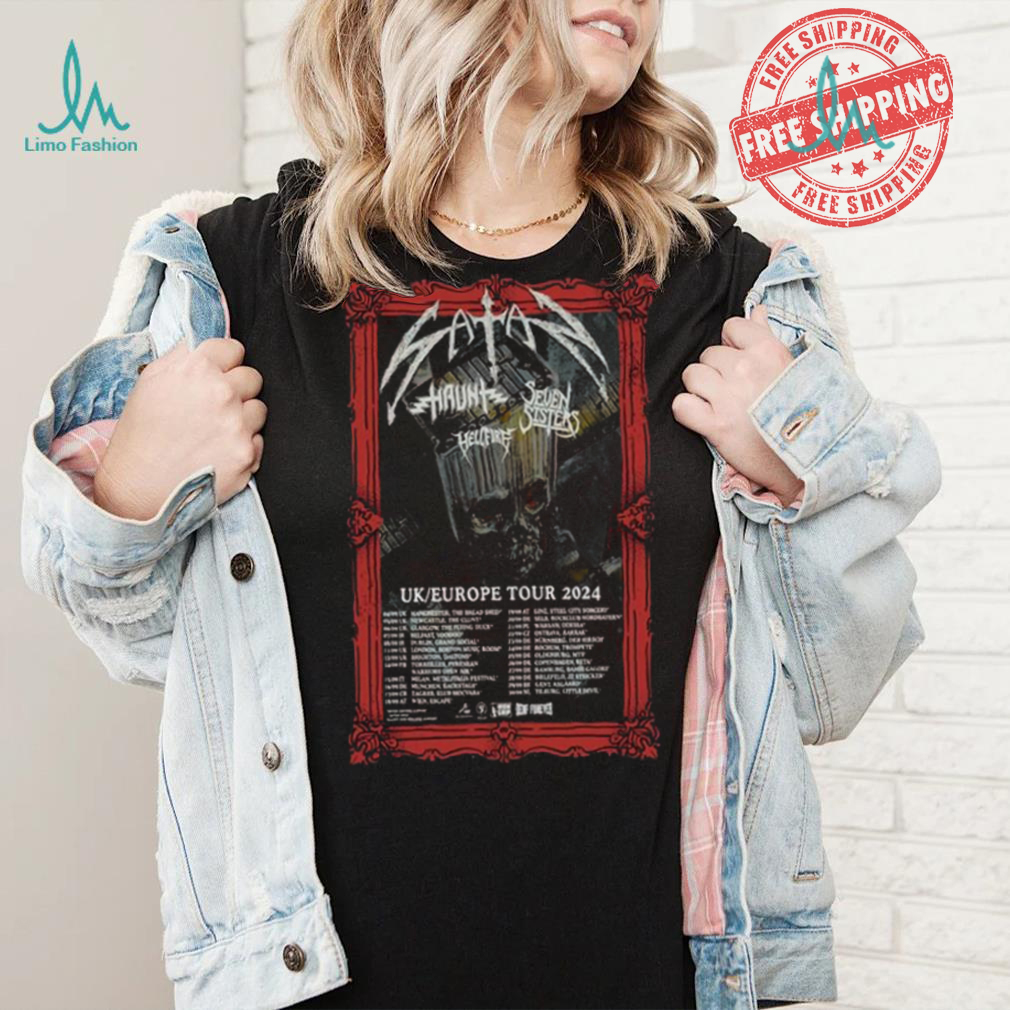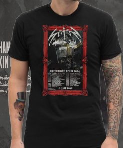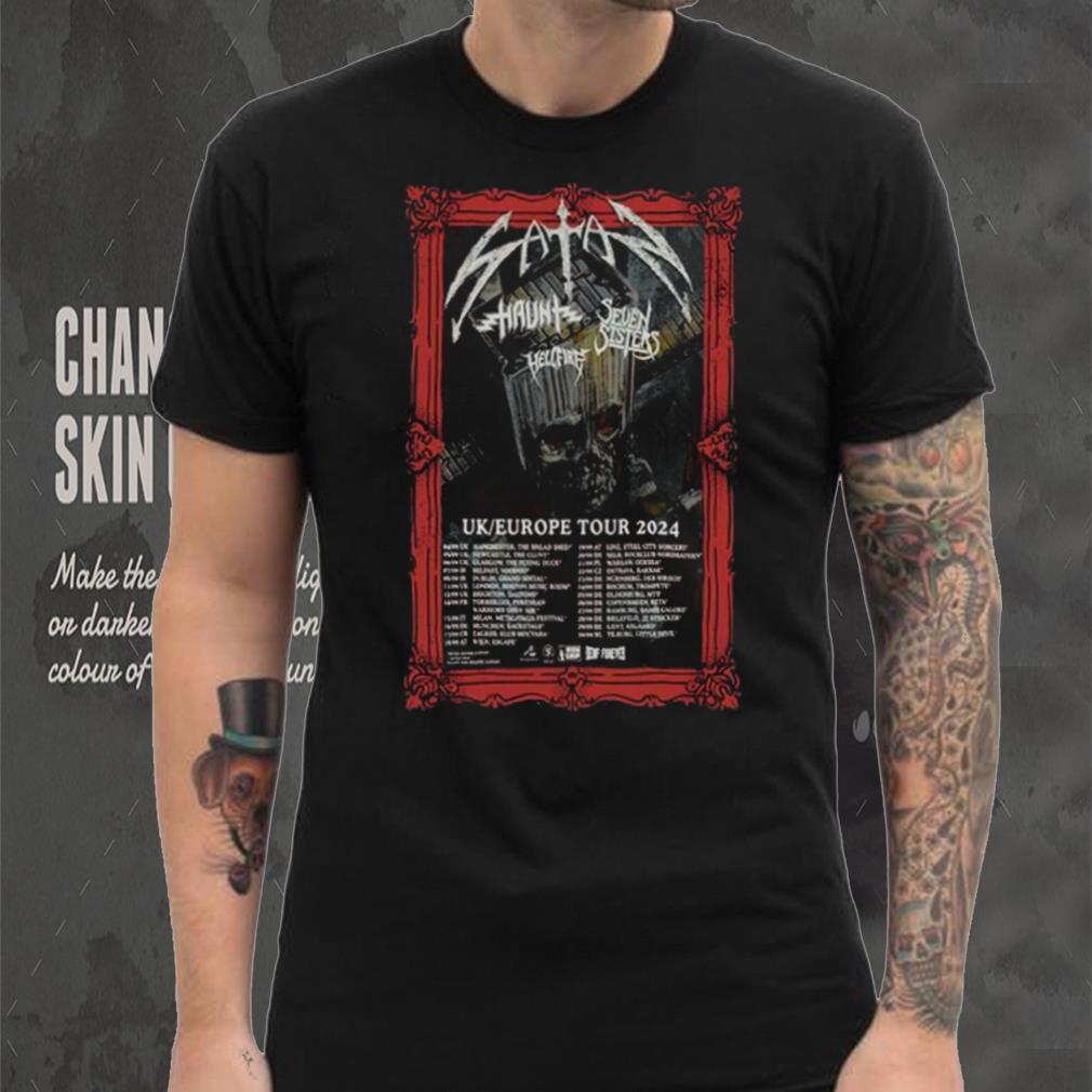 At the other outpost also all was finished. During this night we reached the Satan Band Poster UK Europe Tour 2024 shirt of the Tannu Ola and descended again into a valley covered with dense bushes and twined with a whole network of small rivers and streams. It was the headwaters of the Buret Hei. About one o’clock we stopped and began to feed our horses, as the grass just there was very good. Here we thought ourselves in safety. We saw many calming indications. On the mountains were seen the grazing herds of reindeers and yaks and approaching Soyots confirmed our supposition. Here behind the Tannu Ola the Soyots had not seen the Red soldiers. We presented to these Soyots a brick of tea and saw them depart happy and sure that we were “Tzagan,” a “good people.