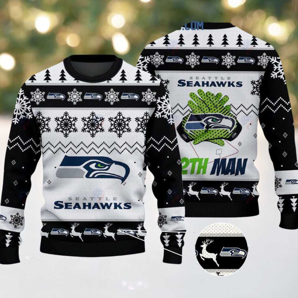 To keep your Seattle Seahawks 12th Man Christmas Ugly Sweater in prime condition, machine wash it cold with similar colors. Tumble dry on a low setting or lay flat to air dry. Avoid using bleach and do not iron directly on the festive design to maintain its integrity and vibrant look.
