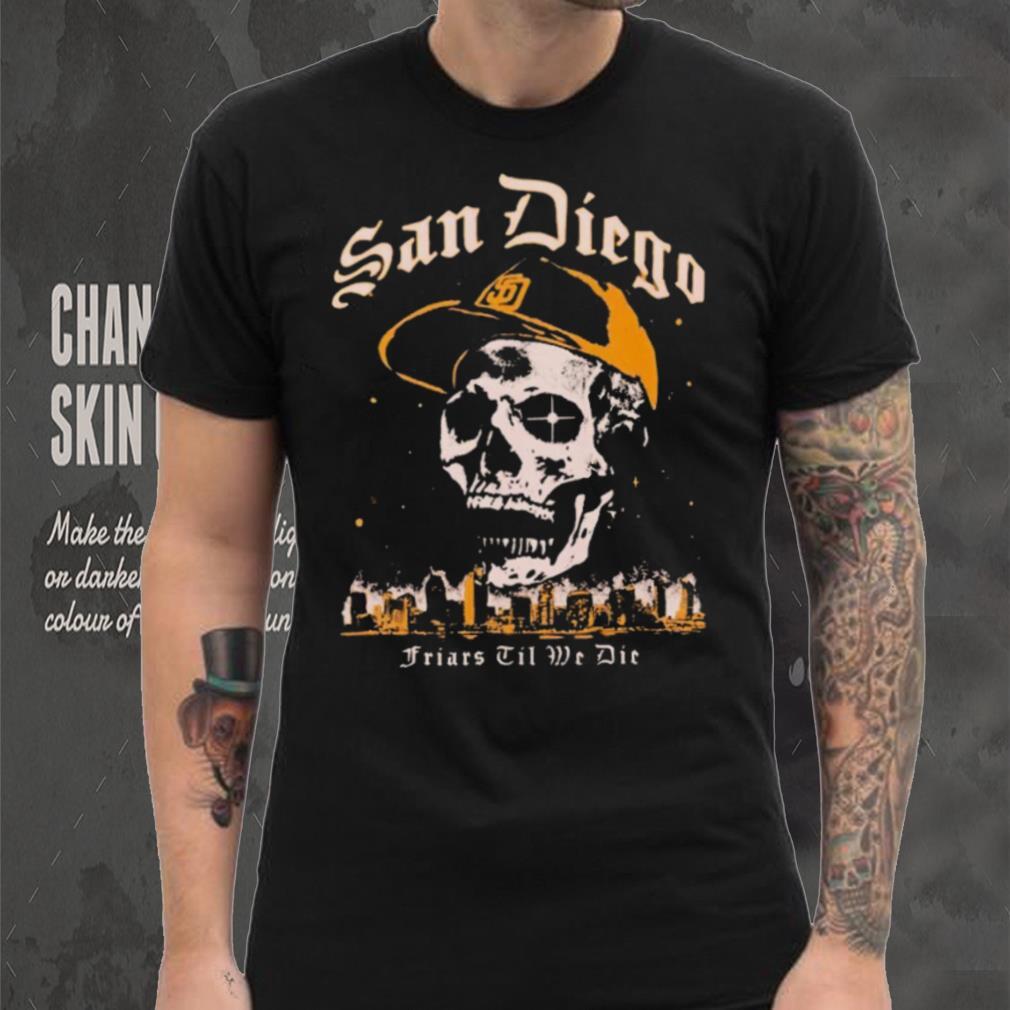 Second, the mother’s Skull San Diego Friars til we die shirt . It should still be respected as either the head matriarch, or more importantly as a person, a human being, what mom’s decision is. Yes, it cause for concern and worry of the other family members if they all still staunchly believe in Christianity, but the choice of believing or not is between the mother and God. It’s her decision and there isn’t anything one can do about it. Remember, the writ of Christianity says each person must come to God/Jesus of their own accord.