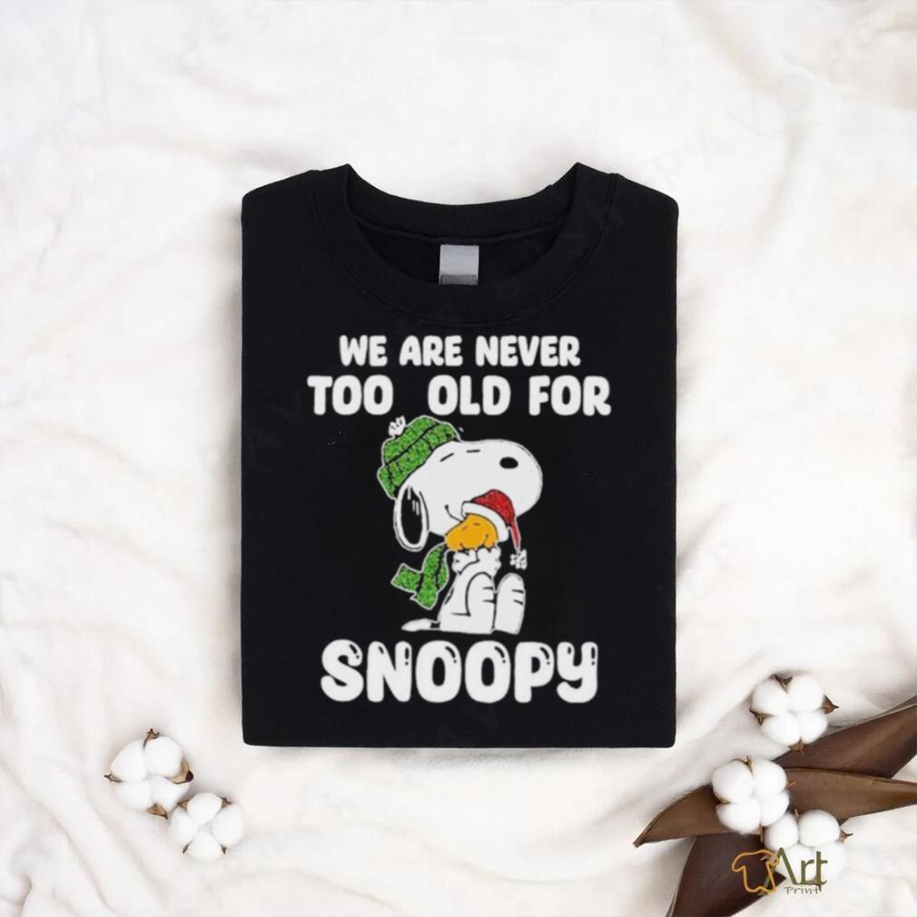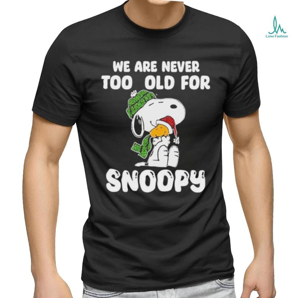 My mother confirmed later, that when she worked for the state’s Snoopy Christmas We Are Never Too Old For Snoopy T Shirt office, these properties were held for generations by families whose ownership couldn’t be easily determined due to inbreeding. I also met a man a couple of years later who worked for the department of public works. He told me he had to go out to these properties occasionally and had observed some outrageous behaviors among the Pine Barrens families that seemed to reinforce what my mother had said – that it scared him to the point that he told his boss that he wouldn’t go out there any more, even if it meant losing his job. He told me this before I even mentioned the camping trip incident. True or not, it creeped me out for certain! Either that, or worse, we could have run into the ‘Jersey Devil’! Never made another trip to that part of the state again…