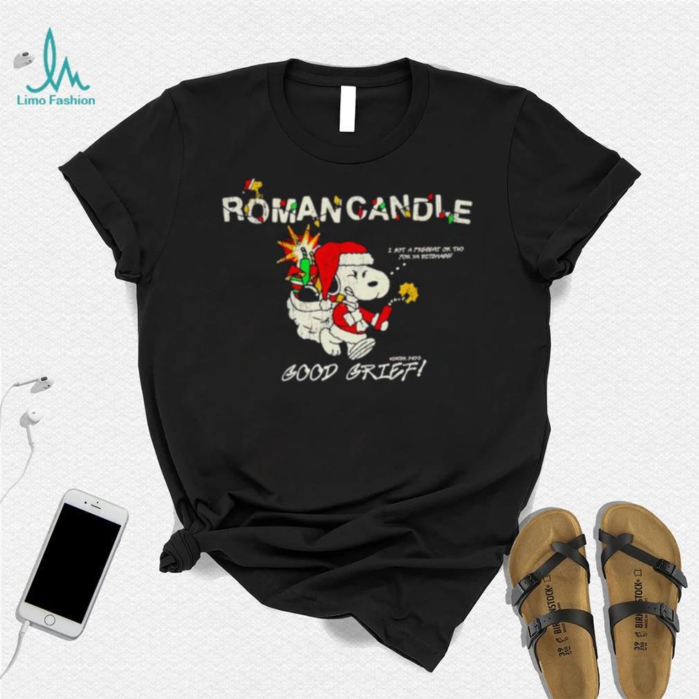 I’m answering a question you didn’t ask, but I think you Snoopy Roman Candle good grief Christmas shirt dump this loser, and find someone who will be grateful when you give him a little gift, and be pleased that you were thinking about him when you were Snoopy Roman Candle good grief Christmas shirt . I’d wear a red or green tee. I’d even wear a pink one if someone gave it to me. Most of the time, my t-shirt isn’t even visible under my polo. And if, for some reason, I had an aversion to wearing a certain color—like maybe it doesn’t make me look as good as other colors—I’d still express my thanks and wear it from time to time as a token of my love. Or, I might say, Oooh, I love them, but this beige one really isn’t me. Would you mind terribly if I took it back? In other words, I’d make my problem *my* problem, and not add a burden to you.