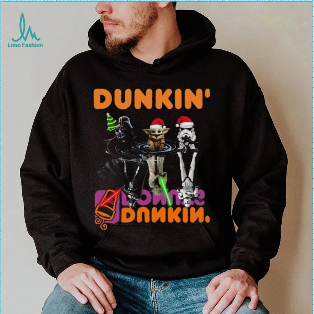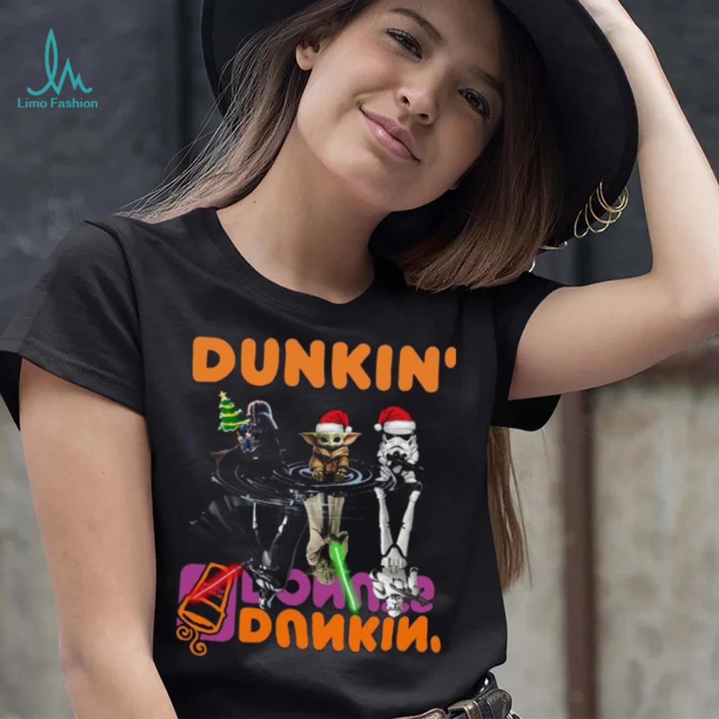 I do not remember Christmas Day itself that year, but the events around theStar Wars Dunkin’ Christmas Shirt this holiday changed my life forever. I was living in Los Angles at the time and was dirt poor as I was very underemployed. I did not have any ambition, but was content. I had a new girl friend (we had been dating for not yet six weeks). I was too poor to buy a Christmas tree. It had been raining for about a week, and was expected to raining for the next week (for those of you that do not know the weather for Los Angeles, this was highly unusual). Three days before Christmas I was driving around with my girlfriend doing some last minute Christmas shopping, when an announcement came on the radio that they were giving away free Christmas trees at a location about one half mile from where we were. I looked at my girlfriend and she said, “Yes, let’s go get a Christmas tree” A couple left turns later, there we were. There was a truck with two trailers full of Christmas trees trying to give them away. The owner of the property where the truck was park had call the police and wanted them to be charged with trespassing. He had Christmas tree lot down the street and this was killing his business.