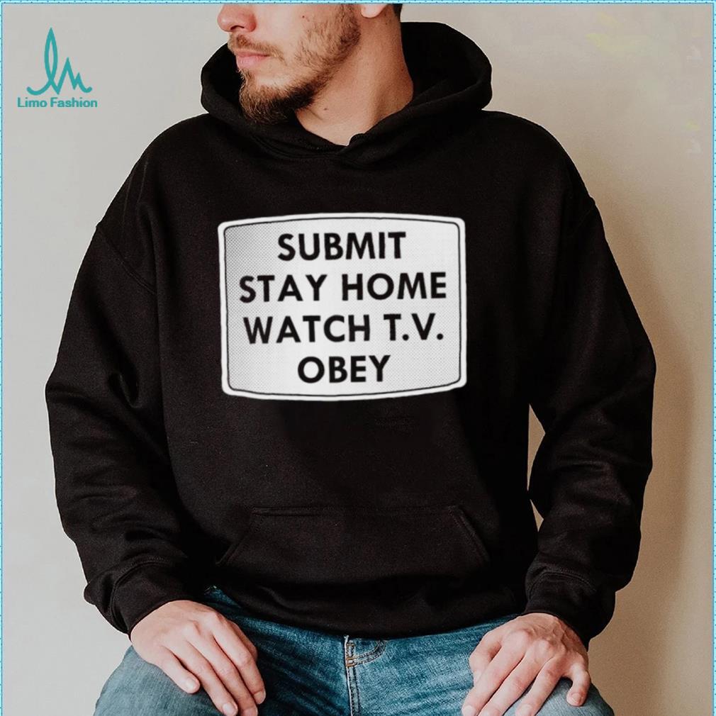 Rugby is a lot more fluid. There is a squad of around 50 in a fully pro club, but only 23 in a match day squad. About 30 players at a club are regular performers in the “first team” squad, whilst the other 20 are developing players or reserves who step in as injury cover. The second tier of English Rugby Union is a mixture of professional and semi-professional players, the 3rd tier is mainly semi-pro. Younger players from the first tier sides are routinely sent out on loan to second and third tier clubs to gain experience. This can work the other way as well — recently an injury crisis in a specialised position (tighthead prop) at my local top flight side led to a semi-pro player who works as a Submit stay home watch T.V. Obey logo shirt from a 3rd tier club being borrowed on loan. One minute he’s teaching kids, the next he’s running out infront of 15,000 supporters alongside international players being paid over $500,000 a year.