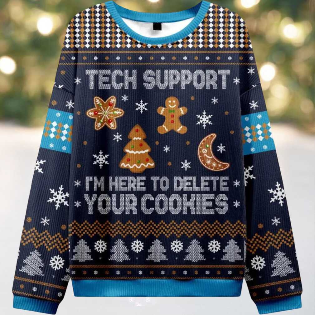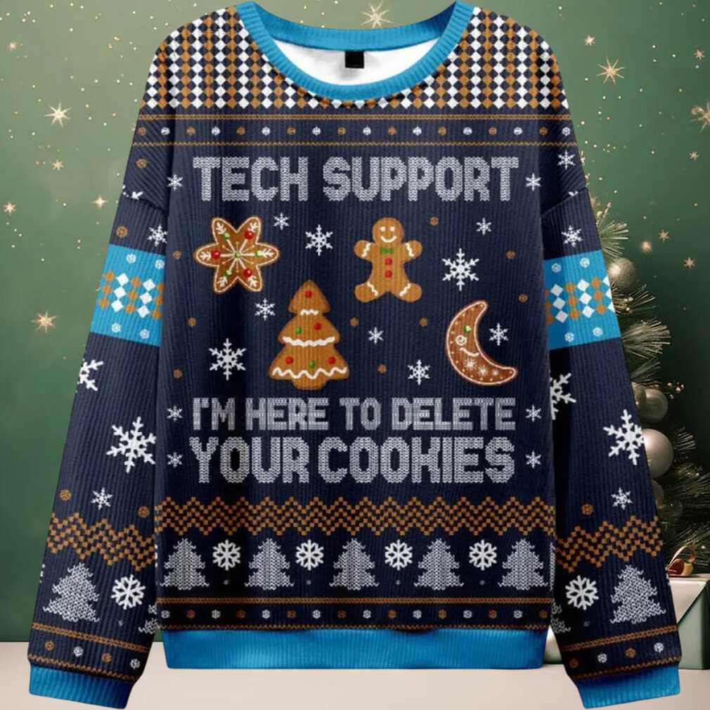 What makes this Tech Support I’m Here To Delete Your Cookies Ugly Christmas Sweater the ultimate upgrade for your holiday wardrobe? It’s the perfect fusion of festive spirit and geeky humor, making it a must-have for anyone in the tech world. Unlike those generic, mass-produced sweaters, this one celebrates your passion for technology and showcases your unique sense of humor. Crafted from a soft and comfortable blend, it ensures you stay cozy whether you’re troubleshooting a network issue, attending a holiday hackathon, or just enjoying a quiet night in with your favorite gadgets. As seen in the first image, the design features a witty “delete your cookies” message with festive elements, creating a memorable and amusing addition to your holiday attire. Available in various sizes, this sweater provides a comfortable and flattering fit for all body types.