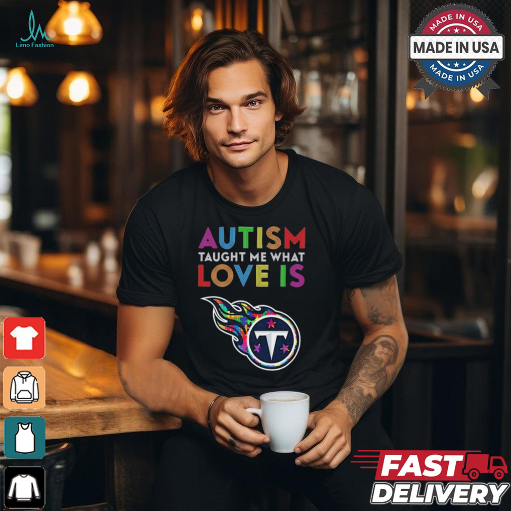 I just kept moving forward, getting my T-shirt out of the Tennessee Titans NFL 2024 Autism Taught Me What Love Is t shirt more and more. Soon the bottom of the T-shirt turned black in a circle, it was the jeans that showed through. I still couldn’t recover from the pleasant sensations that the wet T-shirt caused, as a new wave of feelings swept over me. It was made by the surface of the water that moved down my buttocks, then smoothly moving to the hips. Now the jeans seemed to be squeezing my legs, as if the air had been sucked out from under them. At a depth of knee-deep water, sneakers were already visible with water. They also became black. Finally, they came to the surface. Water was flowing through the holes, and after a couple of steps along the shore, I stopped.