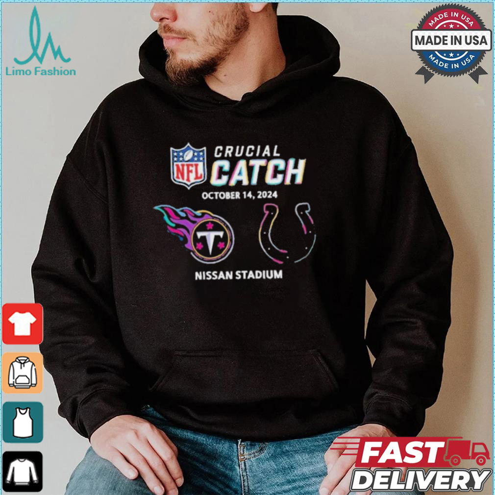 In terms of skills it depends what position they are moving from and to, but I think a season of training with a pro side and some regional amateur rugby games in the lower leagues followed by 1-2 seasons playing below the top flight would be required, if they had the right attributes to reach the top flight. It could be 2 years in total for a winger, or 4 for a more involved position with higher technical and tactical requirements. A player with exceptional physical attributes like being able to run a sub-11 second 100m at 275lbs and a lethal side-step or being fit at 300lbs and immensely strong and Tennessee Titans Vs Indianapolis Colts October 14, 2024 NFL Crucial Catch t shirt explosive might make it earlier as their attacking threat with the ball in hand would do more to cancel out their shortcomings than a more physcially average player.