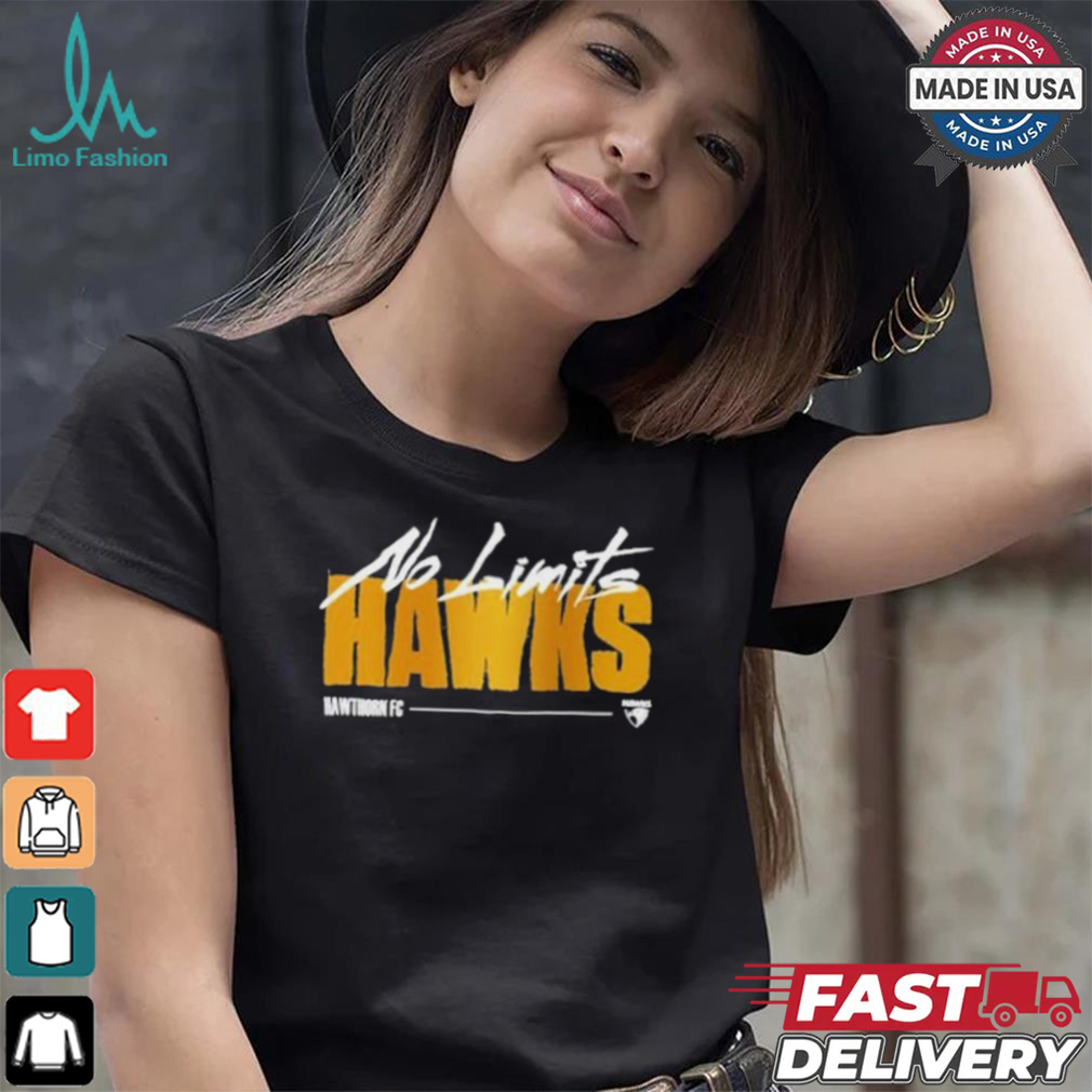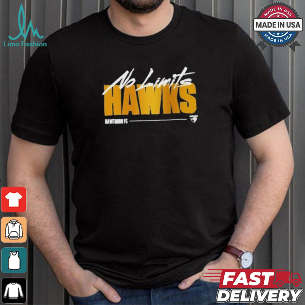 My funny story is when Santa put himself on the naughty list. I travelled the The Finals No Limits Hawks Hawthorn T shirt home from work a few years ago, and I enjoyed all the Christmas lights and decorations every night. One house had a huge blow up Santa on top of the garage, with his arm raised, waving at you when the wind blew. One day I left work early, and it was still daylight. As I turned the corner on this windy day, I saw Santa was a bit deflated. He was slightly bent over and his arm had fallen down so that his hand was between his legs, and the wind was blowing a bit, and he was gently bobbing up and down, up and down, and he seemed to be enjoying himself entirely too much! I was crying with laughter, and I can never look at Santa again without flashbacks.