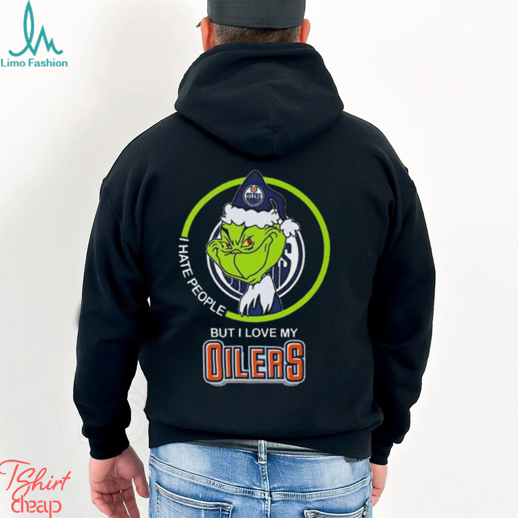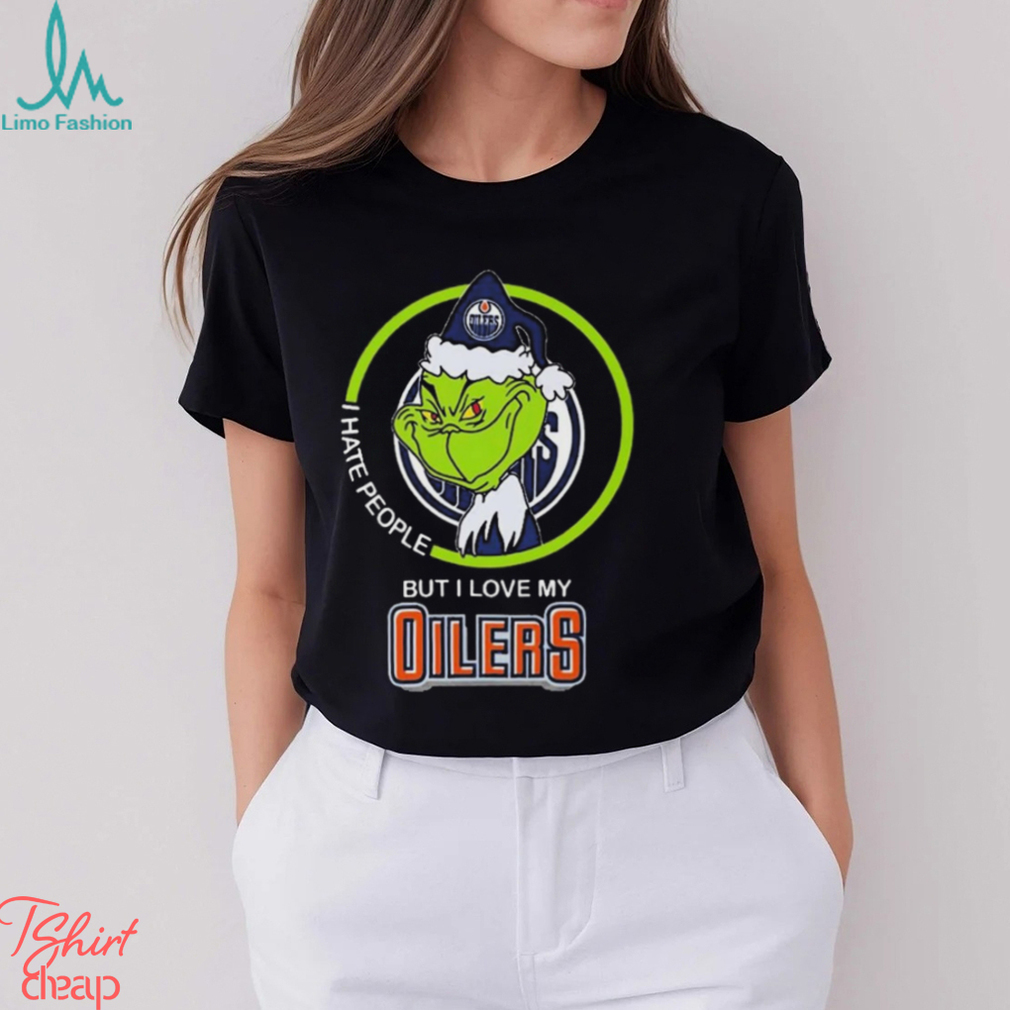 Many of the The Grinch I Hate People But I Love My Edmonton Oilers Logo T Shirt Christmas customs were inherited from older Winter Solstice celebrations—including greenery indoors, feasting and gift-giving. It seems quite likely that the celebration of the birth of Jesus was scheduled at that time in order to piggy-back on existing holiday observances. Halloween is very directly descended from the old Celtic feast of Samhain, when the dead return to visit the living. Modern Pagans observe this and Beltane (May Day) as their major holidays, the Feast of the Dead and the Feast of the Living on opposite sides of the Wheel of the Year. Easter’s Pagan connections are suggested by its English name, Eostara being a Pagan Germanic Goddess associated with the Spring Equinox. The bunnies and eggs probably go back to Pagan times as well.
