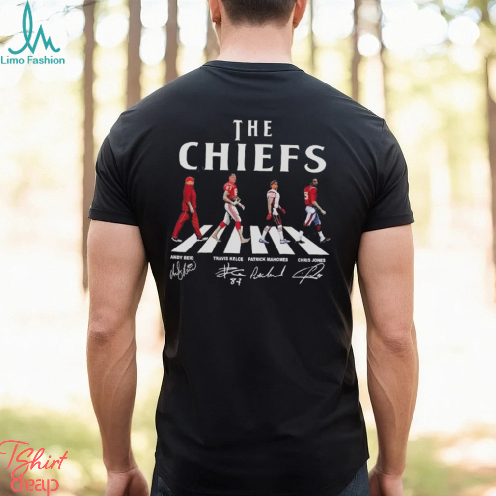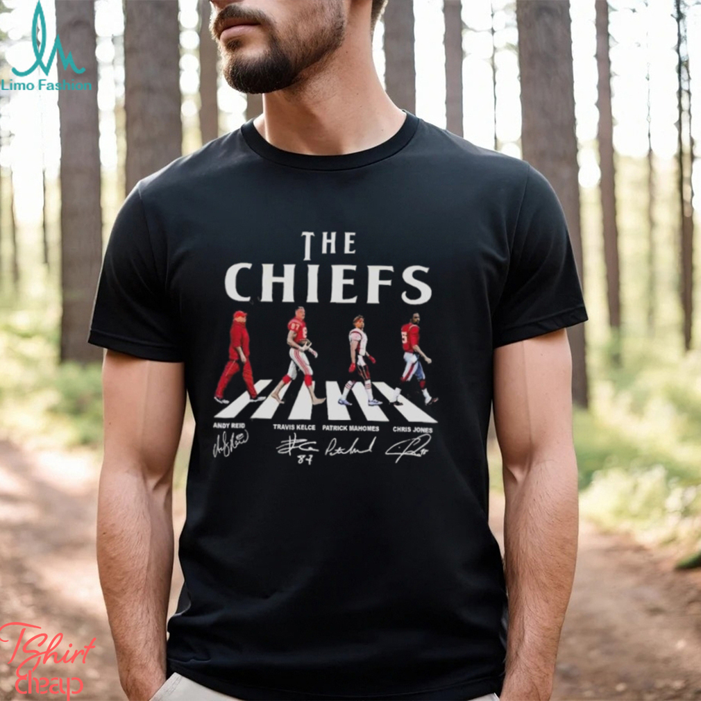 Many of the The Kansas City Chiefs Walking Abbey Road Super Bowl LVII Signatures Shirt Christmas customs were inherited from older Winter Solstice celebrations—including greenery indoors, feasting and gift-giving. It seems quite likely that the celebration of the birth of Jesus was scheduled at that time in order to piggy-back on existing holiday observances. Halloween is very directly descended from the old Celtic feast of Samhain, when the dead return to visit the living. Modern Pagans observe this and Beltane (May Day) as their major holidays, the Feast of the Dead and the Feast of the Living on opposite sides of the Wheel of the Year. Easter’s Pagan connections are suggested by its English name, Eostara being a Pagan Germanic Goddess associated with the Spring Equinox. The bunnies and eggs probably go back to Pagan times as well.