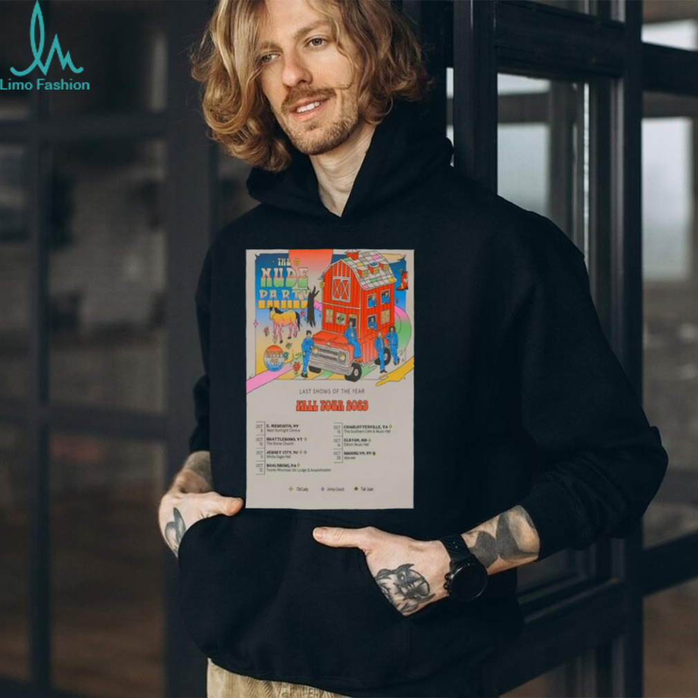 This can be argued through existentialist philosophy which says that existence precedes essence. If there is no one present there, physically it should make a noise as observed elsewhere but since no one is there to experience it, it cannot be registered. So, to answer the The Nude Party Last Show Of The Year Fall October 2023 Tour Poster Shirt , it does make ‘sound’ as we know it but it does not matter in effect just like sun shining on the other part of the globe when you are sleeping at night.