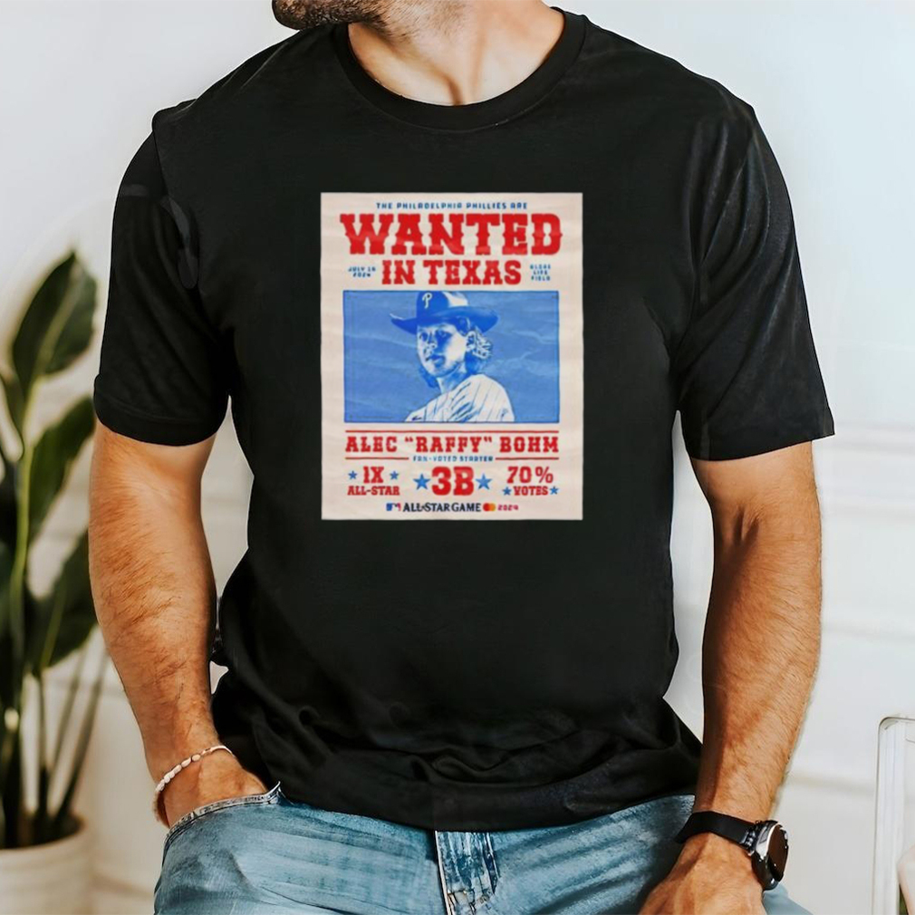 Adding to the growing list of The Philadelphia Phillies are wanted in Texas Alec Raffy Bohm 2024 shirt for Biden’s shaky and halting debate, the president said former President Donald Trump was loud and distracting when it was Biden’s turn to speak, despite Trump’s mic being turned off by the CNN moderators.The split-screen telecast does not support Biden’s claims of a disruptive Trump, which showed the former president engaging in expressions of mocking curiosity, but not the loud, boisterous outbursts Biden described.