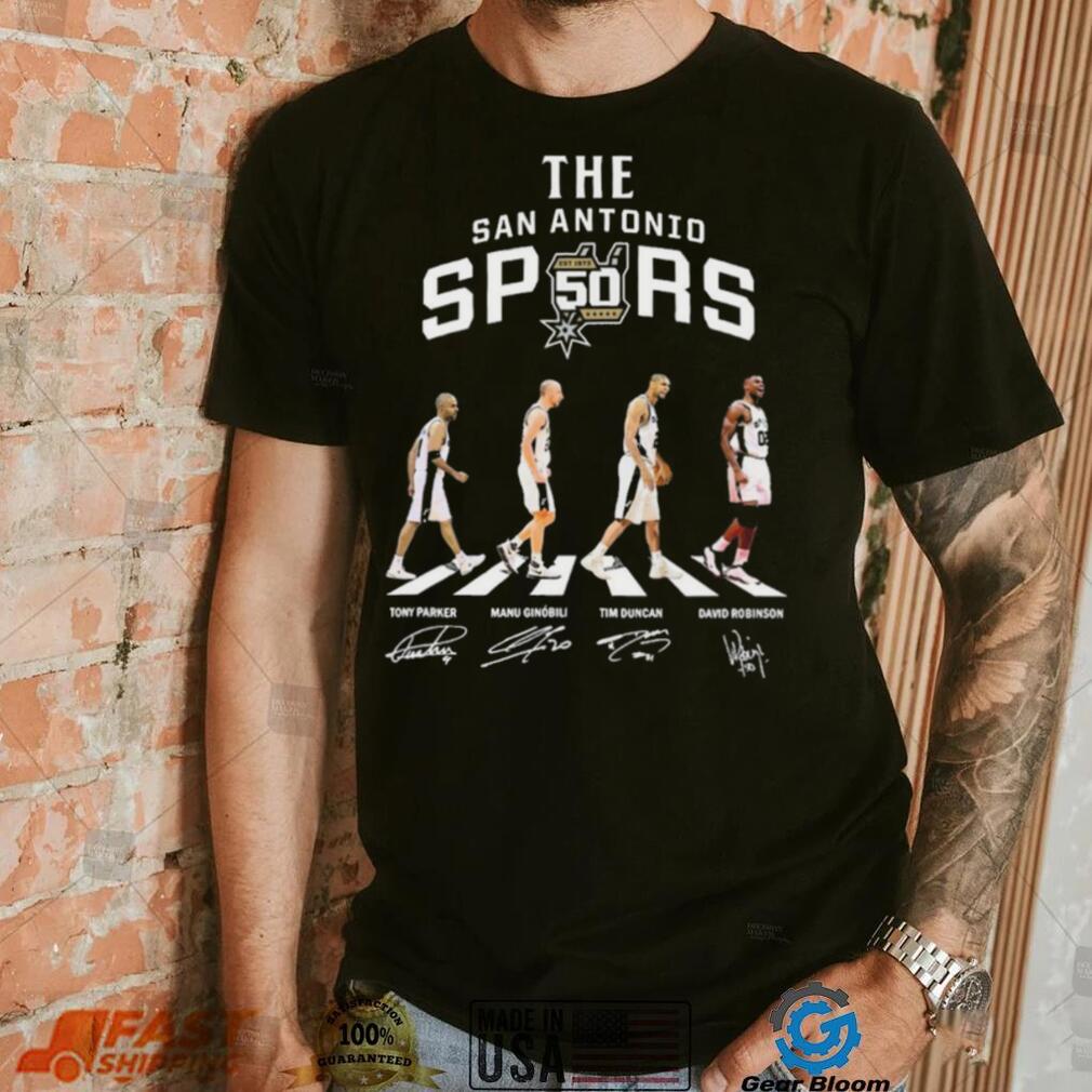Christmas decorations are a The San Antonio Spurs 50th Season Abbey Road Signatures Shirt affectation. Whether one puts them up or doesn’t put them up, whether one leaves them up or takes them down, whether they are put up in January or any other time before December, has no impact on the superstition defined as luck. Good luck and bad luck are merely characterizations of serendipitous occurrences that are random in nature but which leave us either going hooray (good luck) or lamenting the vagaries of uncaring nature (bad luck). But worrying about or praying about or hoping for either as the case may be, like astrology for example, is simply superstitious dreck. As a native yo the city I must say there are three a places that I would suggest to visitors to really get the best holiday scene amd spirit. My first pick is going to be Westfield Mall’s extended outdoor shopping area Union Square. Located at the corner of Powell and Geary in the heart of downtown San Francisco the Christmas spirit is reminiscent of the movie “A Miracle on 24th Street”. That is minus the snow.