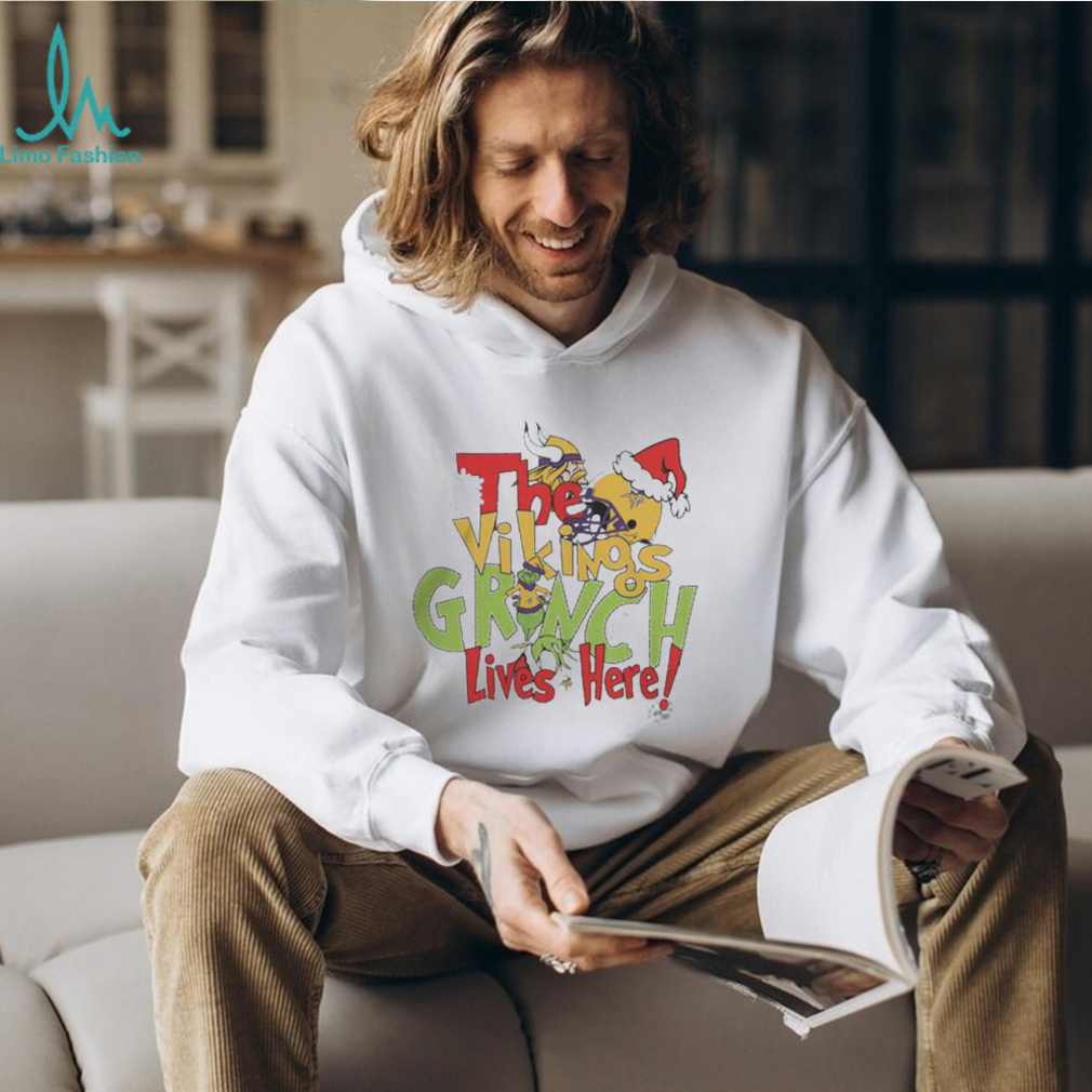 Top The Minnesota Vikings Football Grinch Lives Here Merry Christmas T Shirt, Hoodie, Sweater, Vneck, Unisex and T-shirt