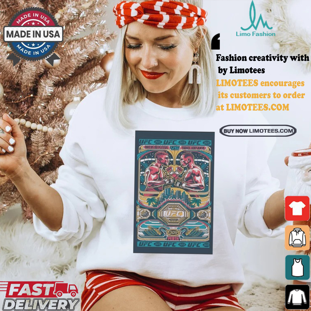 Christmas decorations are a UFC 305 Israel Adesanya And Dricus Du Plessis Perth Australia Poster Shirt affectation. Whether one puts them up or doesn’t put them up, whether one leaves them up or takes them down, whether they are put up in January or any other time before December, has no impact on the superstition defined as luck. Good luck and bad luck are merely characterizations of serendipitous occurrences that are random in nature but which leave us either going hooray (good luck) or lamenting the vagaries of uncaring nature (bad luck). But worrying about or praying about or hoping for either as the case may be, like astrology for example, is simply superstitious dreck. As a native yo the city I must say there are three a places that I would suggest to visitors to really get the best holiday scene amd spirit. My first pick is going to be Westfield Mall’s extended outdoor shopping area Union Square. Located at the corner of Powell and Geary in the heart of downtown San Francisco the Christmas spirit is reminiscent of the movie “A Miracle on 24th Street”. That is minus the snow.
