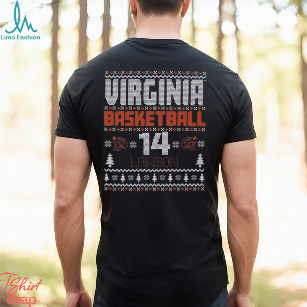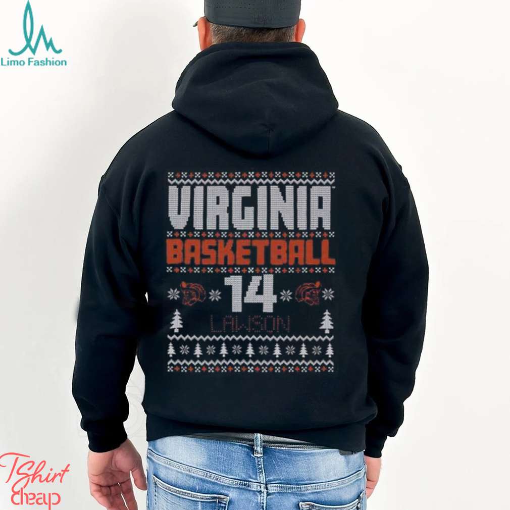 ‘On the evening before Christmas Day, one of the parlours is lighted up by the Virginia – Ncaa Women’s Basketball Kaydan Lawson 14 Sweatshirt T Shirt, into which the parents must not go; a great yew bough is fastened on the table at a little distance from the wall, a multitude of little tapers are fixed in the bough … and coloured paper etc. hangs and flutters from the twigs. Under this bough the children lay out the presents they mean for their parents, still concealing in their pockets what they intend for each other.” The shadow of the bough and its appendages on the wall, and arching over on the ceiling, made a pretty picture, and then the raptures of the very little ones, when at last the twings and their needles began to take fire and snap! — Oh, it was a delight for them! Formerly, and still in all the smaller towns and villages throughout North Germany, these presents were sent by all the parents to some one fellow, who in high buskins, a white robe, a mask, and an enormous flax wig, personate Knecht Rupert, the servant Rupert. On Christmas night he goes round to every house, and says that Jesus christ his master sent him thither, the parents and elder children receive him with great pomp of reverence, while the little ones are most terribly frightened.