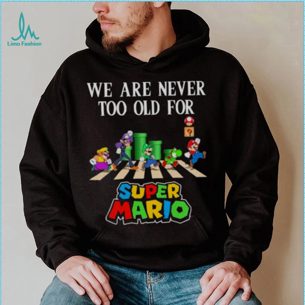 My grandfather was fond of We are never too old for Super Mario abbey road 2023 shirt. When diabetes affected his legs and made him immobile, he continued to whistle. When glaucoma affected his eyes and he lost his eyesight, he continued to whistle. As someone in her early 20s, I found my granddad’s immense pleasure from life overwhelming and infectious. Here was a person who was losing all his senses, yet was gracious enough to utilize and maximize his happiness from the senses he still retained. Try whistling. It improves your lung capacity and will send more oxygen into your bloodstream, making you feel better instantly.Try cooking. I hear it is quite therapeutic when used to counter depression. Try duck meat (if you eat non-veg). If you have trouble sleeping, I read that tryptophan (an amino acid in duck meat) puts you to sleep instantly. Alternatives: try honey with milk before sleeping.