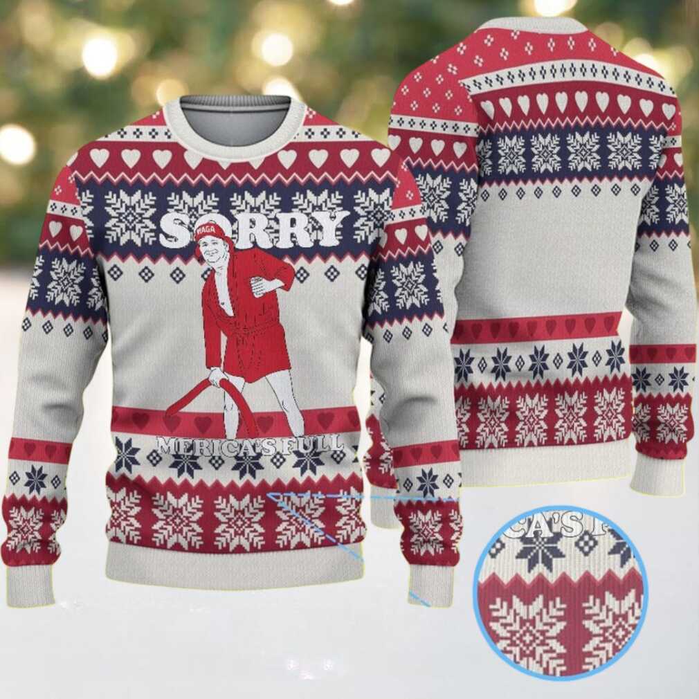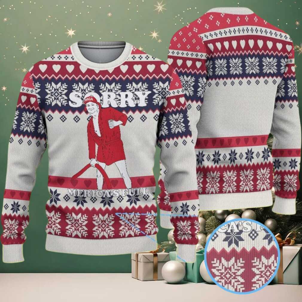 This White, Red & Navy Snowflake Heart Pattern Donald Trump “Sorry Merica’s Full” Ugly Christmas Sweater is for the individual with a strong sense of humor and a knack for memorable holiday fashion. It’s perfect for supporters looking to express their views with a smile, or anyone who enjoys a good political parody during the festive season. Imagine wearing this to a family gathering, a friend’s party, or even a local pub crawl – it’s a guaranteed conversation starter, whether you’re explaining the joke or simply enjoying the reactions. It also makes for an incredibly unique gift for someone who follows politics closely or loves collecting novelty Christmas sweaters. This is more than just a piece of clothing; it’s a statement, a joke, and a piece of holiday fun all rolled into one.